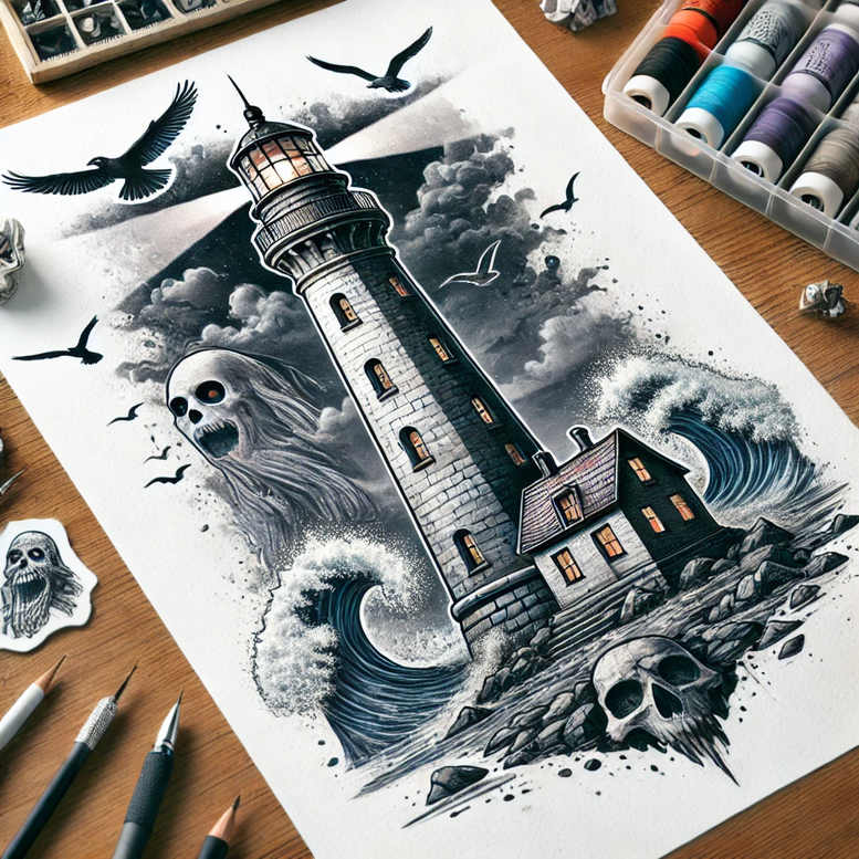This AI-generated tattoo project presents a stormy seascape centered on a tall lighthouse, with a looming skull perched near jagged rocks and a small house beside the tower. Seagulls wheel overhead as waves crash against the shore, all rendered in black and grey ink with crisp line work and bold shading. The composition blends symbolism: the lighthouse stands for guidance through darkness, the skull hints at mortality, and the roiling sea embodies change and resilience. Light and shadow interplay to create depth, while the clouds and surf lend a cinematic mood appropriate for a dramatic back piece or sleeve. The design relies on careful contrast between fine line accents and solid fills to maintain clarity on skin, delivering a strong tattoo design that reads well at different sizes. It is easily scalable—from a compact tattoo to a larger custom tattoo design—while preserving detail through high-contrast black and grey work. The narrative invites personal interpretation: a memory, a metaphor for navigating life’s rough waters, or a tribute to seafaring roots, yet remains a universally meaningful tattoo concept. Given its AI origin, this project serves as a precise, magazine-ready reference for artists seeking a cover-up-friendly composition, especially when covering darker existing ink. For clients aiming to conceal prior markings, the dense shadows around the lighthouse, skull, and crashing waves offer effective camouflage. Keywords woven through the description include tattoo, tattoo design, meaningful tattoos, black and grey, custom tattoo design, body art, ink, fine line tattoo, realistic tattoo, seascape, lighthouse, skull, waves, and cover-up potential.