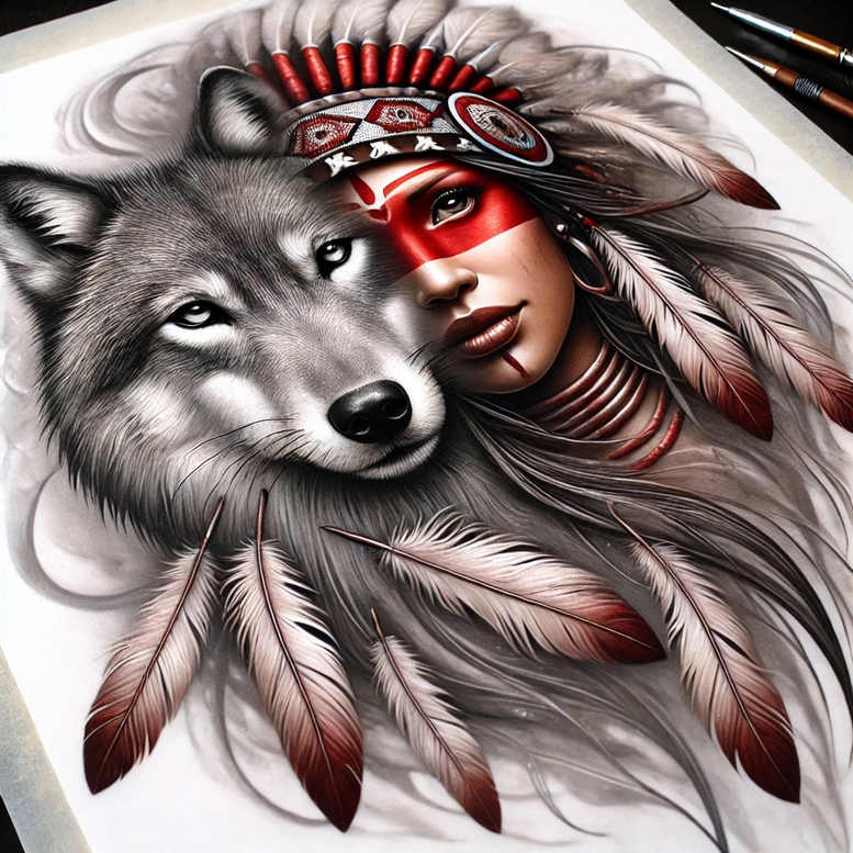 This AI-generated tattoo project presents a bold dialogue between two primal forces: a vigilant wolf and a woman styled as a ceremonial warrior, composed in a cohesive black and grey palette with thin crimson accents. The wolf’s head anchors the left side of the composition, its fur rendered with soft gradations and crisp line work that capture texture and volume, while the woman’s face emerges from the right with red facial paint and a feathered headband that signals ritual symbolism and personal meaning. The feathers arc around the pair, their subtle shading and fine detail creating kinetic motion that guides the eye across the layout. Jewelry such as a circular earring adds a small but precise point of contrast, while the flowing hair interlaces with the plumage to form a unified silhouette. The technique leans toward realism within the constraints of grayscale ink, using smooth transitions, careful layering, and controlled contrast to preserve legibility on skin, even as the piece grows to larger canvases like the back, chest, or shoulder. This cover-up-friendly design excels where older ink needs renewal, because the dark zones provide ample masking power while the new shading redefines space with bold depth. In symbolism, the wolf embodies loyalty and guardianship, the ceremonial headband and red paint evoke courage and cultural resonance, and the composition as a whole speaks to strength, protection, and personal identity. For tattoo enthusiasts seeking meaningful tattoos, this concept offers a compelling template for a custom tattoo design that can be tailored in size and placement, while keeping the core narrative intact. As an AI-generated tattoo project, it showcases how modern algorithms can inspire human artisans to translate a dramatic scene into a wearable work of body art, with careful attention to form, proportion, and ink behavior. If desired, refinements can introduce minor adjustments to line weight or shading to suit individual skin tone and lifestyle, ensuring longevity of the portrait and its protective aura.