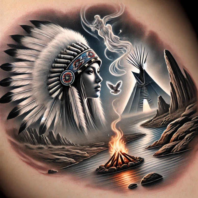 An expansive black-and-grey tattoo design that blends portrait realism with a rugged landscape. The central figure is a woman wearing a dramatic Native American headdress, her face rendered in soft grayscale with careful tonal transitions that capture a focused gaze and subtle skin texture. The headdress cascades with elongated feathers, each feather delicately shaded to create a sense of motion and texture. Behind the figure, a campfire crackles on the shore of a winding river, its flames lifting into the air and casting warm light on surrounding rocks. A teepee rises in the midground, its silhouette etched against sculpted mountains and a sweeping landscape, while a white bird arcs through the smoky air and wisps of breath blend with the sky. The composition uses negative space and atmospheric shading to merge portrait and landscape into a cohesive body of art. Subtle smoke trails connect elemental motifs, suggesting stories and journeys across time. The piece relies on refined line work, smooth gradients, and high-contrast blacks to render depth, with the campfire adding a controlled splash of color against the black-and-grey palette. As an AI-generated tattoo project, the design demonstrates how modern tooling can translate symbolic imagery into a bold, meaningful tattoo design suitable for large-scale canvases, offering a narrative about memory, tradition, and inner strength. It sits within the realm of tribal and realistic tattoo aesthetics, providing potential as a cover-to-cover concept for sleeves or back pieces while preserving the precision of fine-line tattoo techniques. This tattoo design invites contemplation of heritage and landscape as a single, flowing ink story, pairing well with body art themes that honor culture, travel, and identity.
