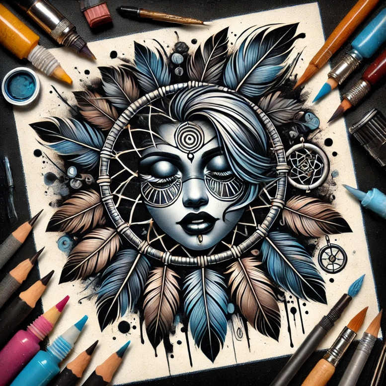 This AI-generated tattoo project presents a dreamcatcher-inspired design: a serene female face centered within a circular web, surrounded by blue and brown feathers. The portrait is rendered in black and grey with smooth gradients and precise line work, while the feathers radiate outward in a balanced rhythm, highlighting cool blue tones against warm earthy browns with crisp white highlights that bring the plumage to life. The dreamcatcher’s intricate web and ring create a graphic pattern that anchors the composition and lends it bold presence for placements on the forearm, shoulder blade, or calf; this density also suggests solid coverage for a cover-up if needed. The piece leans toward a fine line tattoo style, combining delicate outlines with controlled shading to achieve depth without sacrificing clarity, a hallmark of modern tattoo design. In terms of meaning, the dreamcatcher evokes protection and guidance, while the human face personalizes the motif, letting wearers imprint symbols such as resilience or memory into a highly adaptable composition. The color scheme—black and grey base with selective blue and brown accents—ensures compatibility with various skin tones and heals well over time, and it aligns with popular terms like tattoo, tattoo design, meaningful tattoos, fine line tattoo, lotus flower tattoo, infinity tattoo, tribal tattoo, rose tattoo design, small tattoos, flower tattoos, custom tattoo design, Japanese style tattoo, black and grey, realistic tattoo, body art, ink. Although this concept originates from an AI-generated workflow, it reads as a polished, magazine-ready tattoo project for discussion with an artist regarding placement, refinement, and finalization. The overall balance of cool and warm hues, together with the circular geometry of the dreamcatcher, conveys harmony and movement across the skin, making this a robust template for a cover-up-ready tattoo design if the client desires to transform old work into a new, meaningful piece.