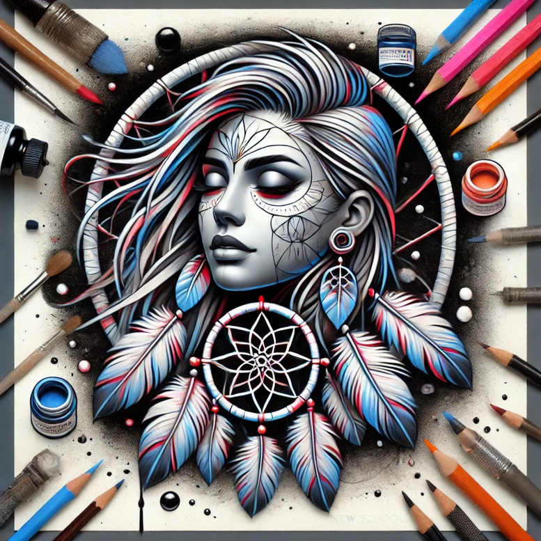 AI-generated tattoo projects image a dreamcatcher portrait framed by a headdress of elongated feathers, with a delicate web resting across the cheek and lines tracing the contours of the face. The composition blends traditional dreamcatcher symbolism with a contemporary fine-line approach, delivering a black and grey tattoo design that feels both timeless and modern. The ring of the dreamcatcher sits at the center, accented by beads and two blue-tinted feathers that contrast with grayscale shading, while the face is rendered with soft gradations and crisp linework to suggest depth and realism. This concept plays with balance between organic feather motifs and geometric patterns, creating a sense of motion around the head. The interplay of light and shadow creates a dramatic, almost photographic quality within the tattoo, emphasizing the circular frame and the symmetry of the headdress. The design translates well as a larger piece on the upper arm, back, or chest, but also scales to smaller canvases for meaningful tattoos. Elements such as the ring, spokes, and web are executed with clean geometry, while the feathers employ subtle gradient washes and fine stippling to simulate texture. The necklace beads provide a punctuated rhythm across the jawline, and the earrings echo the circular motif, reinforcing cohesion. As an AI-generated tattoo project, it demonstrates how digital tooling can craft precise linework and shading that tattoo artists can translate to skin, preserving intent while offering a starting point for custom tattoo design conversations. For collectors seeking a distinctive tattoo design, the concept blends Japanese-inspired restraint with a Western dream motif, yielding a versatile piece that can be hardened into a detailed sleeve or adapted to a solitary shoulder or ribcage tattoo. The language of symbolism—the dreamcatcher’s protective web, the feathers’ flight, the hoop’s circle—resonates with ideas of memory, protection, and personal growth. In practice, this design would be realized with a balance of black ink and cool grey washes, using clean line work to maintain readability at smaller sizes and richer shading for larger formats. It intentionally embraces a modern silhouette while honoring traditional iconography, making it a strong choice for meaningful tattoos, small tattoos, or a personal body art statement.