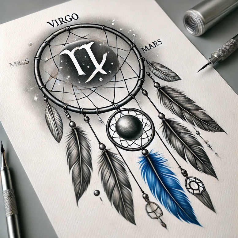 This AI-generated tattoo project concept showcases a dreamcatcher rendered in black and grey with a striking blue feather, combining meticulous linework and soft shading to achieve a realistic, fine-line appearance. The outer ring is wrapped and supports a dense, geometric web that forms a cohesive pattern, with delicate strings hanging down and adorned beads that guide the eye along the composition. The blue feather provides a bold accent against the monochrome palette, suggesting spiritual guidance and vibrant energy, while the surrounding shading adds depth and a lifelike texture that translates well to skin. Visible in the piece are subtle glyphs and labels such as Virgo and Mars along the upper arc, lending an astrological layer that can deepen personal meaning for the wearer. The design relies on high-contrast black and grey ink, with crisp lines and gradual tonal transitions that typify the fine-line tattoo style, making it suitable for both small or large applications and particularly well-suited as a cover-up due to its dense shading areas and strong silhouette. As a tattoo concept, it aligns with meaningful tattoos, body art, and custom tattoo design, offering a versatile foundation for lotus flower tattoo, infinity tattoo, or Japanese style tattoo adaptations while preserving the core symbolism of protection and dream-catching. This project emphasizes pattern through the dreamcatcher web, yet remains adaptable for tribal or realistic interpretations, ensuring broad appeal for clients seeking a sophisticated, elegant piece. The piece invites personalization—colors, feather counts, or zodiac glyphs can be adjusted to reflect individual narratives, while the fine-line execution preserves finesse and a timeless aesthetic in ink.