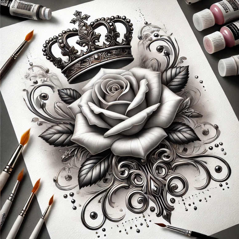This grayscale composition centers a blooming rose crowned with an ornate tiara, flanked by curling filigree, leaves, and ornamental swirls. The petals are carved with delicate gradients and tight fine lines that create a soft, velvety texture, while the crown features micro-accents, beading, and lace-like filigree that catch light as the skin moves. Surrounding motifs form a graphic pattern that gives the piece a sense of rhythm and unity, ensuring the design reads clearly at both small and large scales. The use of black and grey ink emphasizes tonal contrasts rather than color, aligning with realistic tattoo aesthetics and a modern, sophisticated look. The central rose symbolizes growth, fidelity, and beauty in adversity, paired with the crown to evoke personal achievement or sovereignty; together they convey a meaningful tattoo about inner strength and grace. The composition relies on negative space to prevent crowding, which helps longevity of the ink and readability over time, making it an excellent choice for a cover-up where existing tattoos or skin textures require a strong, elegant replacement. This is an AI-generated tattoo project, illustrating a consistently balanced form and precise line structure suitable for a custom tattoo design. The piece also nods to influences from Japanese style tattoo through its structured layering and ornamental motifs, while retaining a universal appeal for lovers of rose tattoos, small tattoos, or larger back and chest pieces. The graphic pattern is a deliberate feature, providing movement and cohesion across the surface; it supports SEO-friendly themes for meaningful tattoos, rose tattoo design, fine line tattoo, and black and grey body art, while offering a versatile template for ink projects that celebrate floral symbolism in modern tattoo culture. If a client seeks a tattoo design that merges classic symbolism with contemporary technique, this AI-generated project demonstrates how refined line work and panel-like composition can translate into a striking, timeless body art piece, ready for a cover-up or seamless extension into a larger sleeve or back piece.