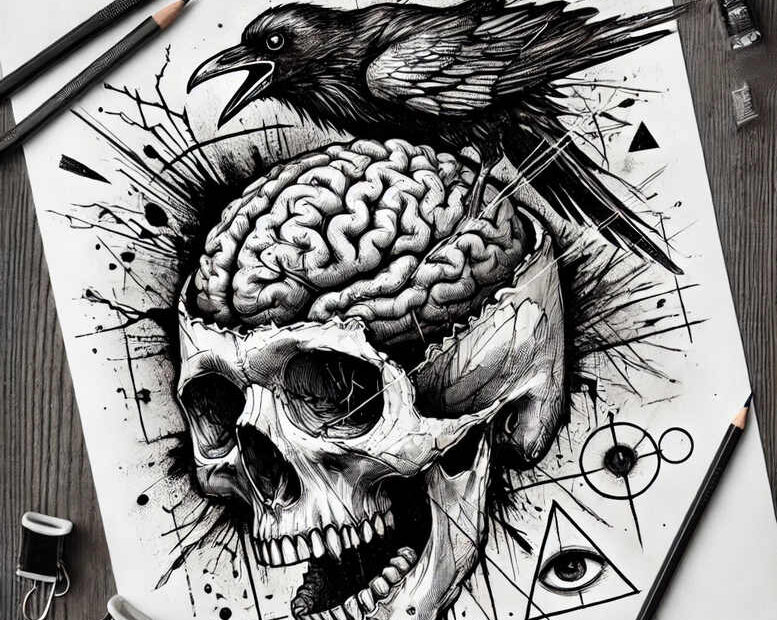 This AI-generated tattoo project presents a stark, high-contrast skull motif where the cranium yields to a rendered brain, creating a visceral center of gravity for the composition. A crow perches atop, its feathers carved with dense black ink and subtle grey shading that lends movement and menace. Surrounding the central form are geometric elements—triangles, circles, and intersecting lines—that radiate outward like constellations, providing structure and a modern edge to a classic hero piece. The overall treatment relies on black and grey realism: crisp line work, layered cross-hatching, and controlled negative space to ensure legibility from up close and readability at a distance. The design emphasizes texture—bone smoothness against fractured sutures, soft plumage against jagged ink splashes—and invites customization in scale, placement, and needle technique. Symbolically, the skull evokes mortality while the brain alludes to intellect and inner life; the crow adds a note of transformation and memory. Because the image integrates heavy shading and a dense field of ink, it is particularly well-suited for a cover-up, offering substantial opacity that can obscure older tattoos beneath. The pattern elements introduce versatility: the geometry can be intensified for a bold, graphic look or fine-tuned for a more subtle, detailed effect. For clients seeking a statement piece, this concept aligns with meaningful tattoos, custom tattoo design, and the wide spectrum of black and grey tattoo styles, from realistic to Japanese-inspired sensibilities. The project embodies the work of ink artists who balance anatomy, symbolism, and technique to craft durable body art that remains impactful for years, regardless of skin tone. In short, this piece merges macabre allure with precision line work, delivering a credible companion for those pursuing large-scale body art or striking small tattoos with lasting contrast. This AI-generated tattoo project integrates global tattoo design vocabulary—tattoo, tattoo design, meaningful tattoos, fine line tattoo, lotus flower tattoo, infinity tattoo, tribal tattoo, rose tattoo design, small tattoos, flower tattoos, custom tattoo design, Japanese style tattoo, black and grey, realistic tattoo, body art, ink—to position itself within contemporary ink culture and inspire personal interpretation.