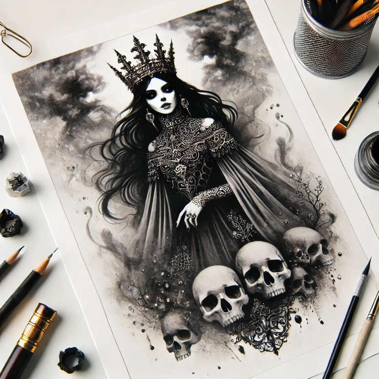 This AI-generated tattoo project concept presents a dramatic Gothic queen figure rendered in black and grey ink. The central composition features a regal woman wearing an ornate crown and intricately patterned armor that resembles lacework and filigree, cascading into a voluminous cape. At her feet, a row of skulls anchors the piece, their stark realism providing contrast against the soft smoke and cloudy background. The design plays with light and shade to create a sense of depth, with fine lines defining delicate jewelry, textiles, and the skeletal forms. The crown and armor are adorned with repeating motifs that read as graphic patterns, giving the piece a tattoo design that blends realism with stylized ornamentation. The overall mood is somber and regal, suggesting themes of mortality, power, and transcendence. The negative space around the queen heightens the focus on the figure and skulls, making this a powerful canvas for black and grey ink. As a concept, it leans toward a full-sleeve or back-piece, but the strong contrast and clear elements also translate well into a large chest panel. The work intentionally embraces a high-contrast approach suitable for a cover-up, where darker areas can blend with or mask existing tattoos, while the skulls serve as a visual anchor that guides the eye along the torso and down the arm. This is an AI-generated tattoo project concept, crafted with a painterly ink technique that favors smooth gradients and crisp linework, ideal for meaningful tattoos such as a Gothic queen theme, a dramatic lotus flower tattoo, or a broader black and grey collection. For search and discovery, this tattoo design integrates keywords like tattoo, tattoo design, meaningful tattoos, fine line tattoo, black and grey, realistic tattoo, body art, ink, and full-spectrum grayscale shading to appeal to collectors seeking unique, custom tattoo design ideas.