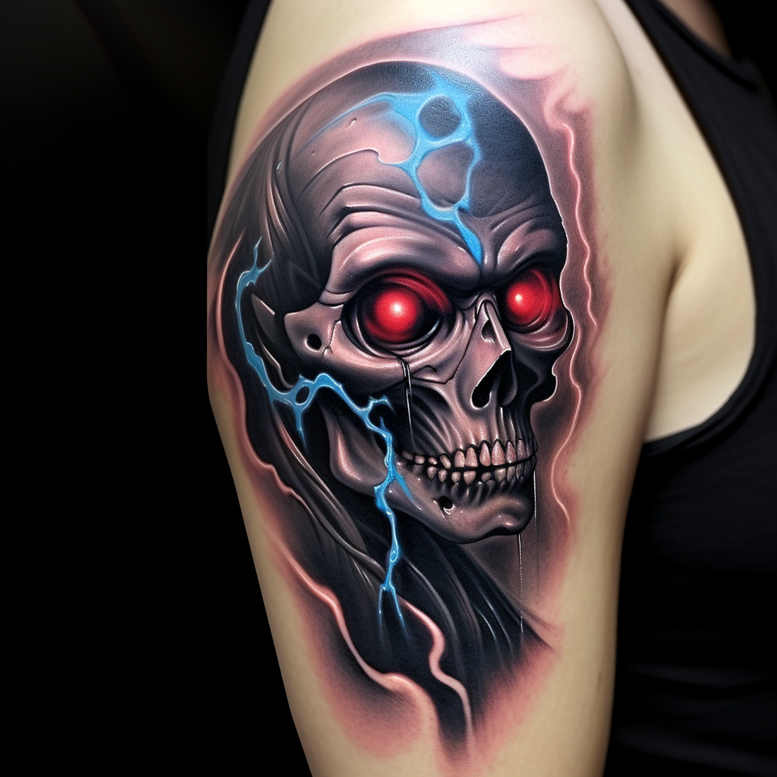 This AI-generated tattoo project presents a dramatic black-and-grey skull inked with hyperreal shading and electric color accents. The central motif is a stylized skull whose hollow eye sockets glow with saturated red, creating a menacing focal point on the upper arm. Jagged electric lines in vivid blue carve through the skull and spill into the surrounding negative space, adding energy, motion, and a modern graphic edge. The artist uses smooth gradients, crisp line work, and careful highlight placement to produce a three-dimensional illusion on skin, with the red eyes and blue bolts standing out against the muted grayscale background. The design balances realism with graphic punch, making the bone texture, sutures, and shading look tactile while the neon accents read as electricity rather than paint. The color palette relies on black and grey tones with red and blue highlights to maximize contrast and readability at different sizes, from a compact shoulder panel to a full upper-arm piece. Because this is a cover-up-oriented concept, the heavy shading and dark backdrop provide a versatile base to conceal prior tattoos while preserving the dramatic red-and-blue signature. In terms of symbolism, skulls evoke mortality and transformation, while the blue lightning signifies energy, change, and resilience—a pairing that resonates with personal meaning for many wearers. The piece nods to realistic tattoo traditions while incorporating graphic elements that align with contemporary body art trends, including bold silhouettes, negative space, and accent veins. As an AI-generated tattoo project, it demonstrates how digital design translates into a strong, permanent statement, with ink-ready lines and tonal balance suitable for a professional tattoo studio. This design can be adapted to different sizes and placements, preserving the strong focal point while allowing for subtle tweaks to suit individual anatomy, skin tone, and preferred level of detail.