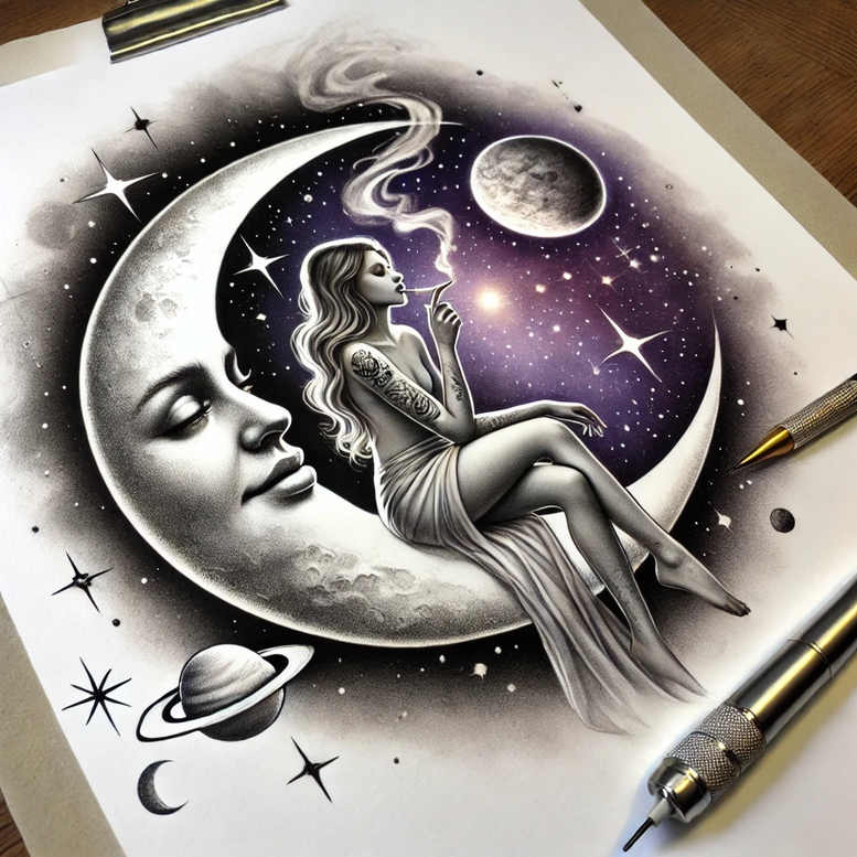 This AI-generated tattoo project presents a moonlit fantasy: a serene woman perched on a crescent moon, smoking a slender cigarette, while a starry cosmos unfolds behind her. Rendered in black and grey, it combines realism with dreamlike atmosphere through meticulous shading, crisp line work, and soft gradient blends. The crescent moon wears a subtle, almost human face; the woman sits with one leg draped over the arc of the moon, her hair a cascade of waves that mirror the smoky tendrils curling from the cigarette. A ringed planet tucks into the lower left corner, and a field of star punctuates the void, giving depth and dimension to the scene. The composition intentionally uses negative space and contrast to create a bold silhouette that reads clearly at tattoo size, which is essential for techniques such as fine line tattoo and black and grey realism. This piece uses a grayscale palette with subtle purple undertones in the background to evoke mystery and the vastness of space, making it a timeless tattoo design for those seeking a meaningful tattoo with a cosmic vibe. The symbolism of the moon often denotes cycles, intuition, and feminine energy, while the seated figure suggests contemplation, independence, and a modern take on traditional celestial imagery. Technical notes: strong contour lines define the edge of the crescent and the figure; smooth shading on the woman’s skin and dress conveys form, while the smoke is rendered with wispy strokes to create movement without overpowering the main subjects. Its clean execution makes it suitable for large formats on the upper arm, back, or thigh, and its high-contrast plan makes it a robust cover-up option should the wearer need to conceal previous ink. The design also satisfies various tattoo design trends, including black and grey realism, space-themed tattoos, and meaningful tattoos that tell a story. This AI-generated tattoo project demonstrates the evolving synergy between digital designs and inking, and it aligns with contemporary body art requirements for quality, readability, and longevity in tattoo ink.