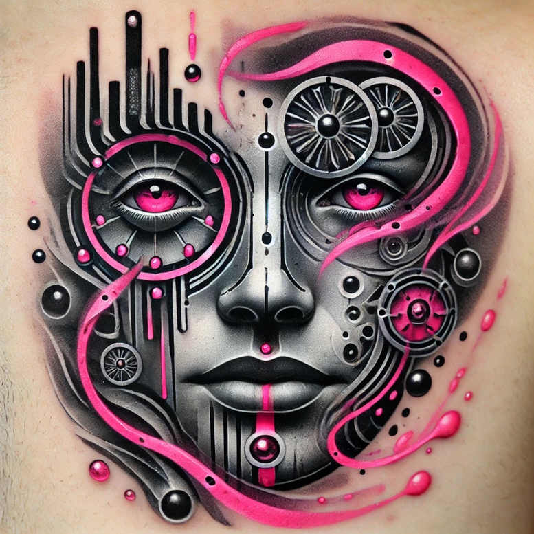 This AI-generated tattoo project concept showcases a bold geometric portrait that fuses human features with mechanical abstractions. The central visage is rendered in black and grey shading, using soft gradients and crisp line work to define the nose, lips and eyes while ring motifs and circular gears frame the cheeks and temples. Neon pink accents braid through the composition, tracing fluid ribbons that weave between linear grooves, circular rings, and dot clusters. The treatment leans toward cybernetic art: concentric circles, radial spokes, and micro-dot stippling create depth and texture, giving the face a sculptural, almost architectural quality. The design reads as a fusion of modern biomechanical aesthetics and refined portraiture, where the pink elements serve as energetic highlights, drawing attention to the eyes and the symmetry of the mask-like visage. It makes strong use of negative space, allowing the background to recede so the subject emerges from the skin, with light and shadow enhancing the three-dimensional form and the motion of magenta threads. This tattoo design remains graphic rather than illustrative, requiring precise line weight and shading to keep the mechanical geometry coherent across curves and contours. Given its dark foundation, it is well suited as a cover-up for older ink while offering the opportunity to introduce brighter hues or additional circuitry later if desired. The concept works as a standalone statement or as part of a sleeve, and the balance of black and grey with neon magenta ensures readability on diverse skin tones. As an AI-generated concept, it demonstrates how contemporary tattoo design can blend technological accents with portrait realism to convey futuristic meaning. Keywords such as tattoo, tattoo design, meaningful tattoos, fine line tattoo, lotus flower tattoo, infinity tattoo, tribal tattoo, rose tattoo design, small tattoos, flower tattoos, custom tattoo design, Japanese style tattoo, black and grey, realistic tattoo, body art, and ink are embedded to optimize discoverability, while the piece also signals its applicability as a cover-up or transformative body art option.