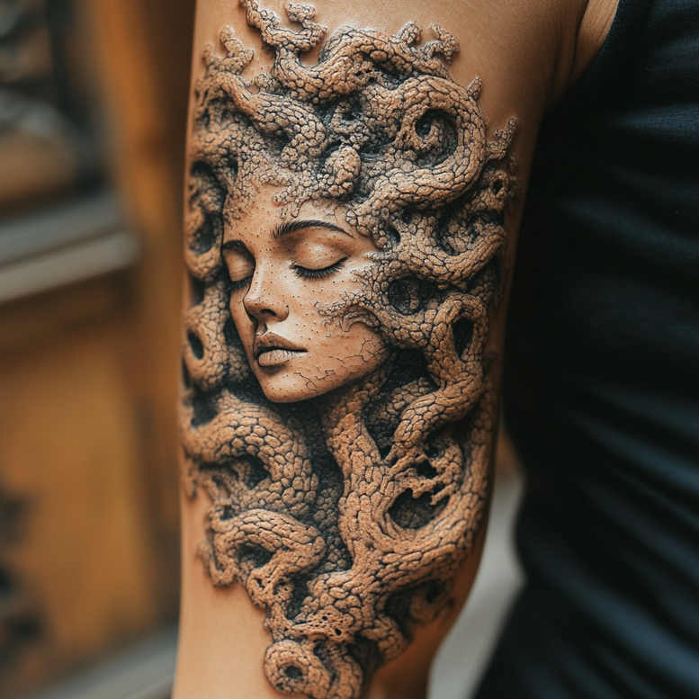 This is an AI-generated tattoo project presenting a Medusa-inspired portrait—a serene female face entwined by living serpents that rise along the forearm. The composition relies on black-and-grey realism, with crisp line work, smooth gradient shading, and subtle stippling to build texture. The skin carries a crackle-like, stone-fired surface that contrasts with the soft features of the face, giving a tactile, sculpture-driven quality. Snakes coil around the head and neck in looping patterns, their scales rendered with careful cross-hatching and micro shading to create depth. The serpents form a dynamic rhythm, guiding the eye from the crown of the head down toward the wrist, while the central face remains a calm focal point with closed eyes and composed lips. The design embraces negative space and strong contrast; deep charcoal shadows anchor the piece, while lighter greys highlight the contours of the cheeks and the curvature of the serpents. The motif blends mythic symbolism—power, rebirth, protection—with a contemporary tattoo language, making it meaningful as a standalone piece or as a cover-up for darker ink, given its density and ability to obscure underlying marks. This is an AI-generated tattoo project, crafted to demonstrate how digital concepts translate into wearable body art; the result is a highly detailed, pattern-rich design that feels both timeless and modern. For placement on the forearm, upper arm, or even calf, the pattern of intertwining serpents provides a strong silhouette that maintains coherence across scales, while the face anchors the composition with human emotion. From a technique standpoint, the work emphasizes black-and-grey shading, fine line precision, and controlled stippling to achieve contrast without losing subtleties in the serpent’s texture. In the broader context of tattoo design, it aligns with meaningful tattoos, fine line tattoo aesthetics, and the enduring appeal of myth-inspired body art; it also serves as a compelling example of a custom tattoo design suitable for enthusiasts of realistic black-and-grey ink, and those seeking a bold but refined piece.