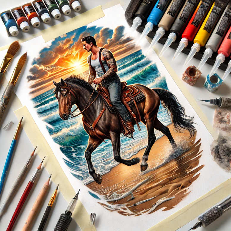 This AI-generated tattoo project presents a highly detailed, full-color scene of a horse and rider galloping along a shoreline at sunset. The composition uses a dynamic diagonal flow: the horse’s arched neck, flaring mane, and rippling musculature contrast with the rider’s balanced posture and tightly drawn reins. The sea behind them curls with foam and turquoise gradients, while the sun sinks low and paints the sky in pale golds, coral pinks, and deep indigo. The beach at their hooves anchors the scene with warm sand tones reflecting the sunset light, producing a natural, cohesive palette that translates well to ink on skin. Executed with crisp line work and layered color, the design leans toward a realistic tattoo aesthetic but accommodates fine line detailing in the horse’s tack, the rider’s denim and suspenders, and the subtle texture of wind-blown fabric. It therefore functions as a versatile tattoo design for large canvases such as the back, chest, or thigh, while remaining scalable for smaller spots if simplified. Symbolically, it embodies journey, resilience, companionship between human and animal, and a spirit of freedom—ideas that resonate with meaningful tattoos and custom tattoo design. As an AI-generated tattoo project, it demonstrates how digital art can inform traditional tattoo practice, offering clean gradients and precise line work for ink. The SEO-friendly language here includes terms like tattoo, tattoo design, meaningful tattoos, fine line tattoo, realistic tattoo, black and grey, body art, ink, and more, giving a broad reference for patients and artists exploring coastal or equestrian imagery.