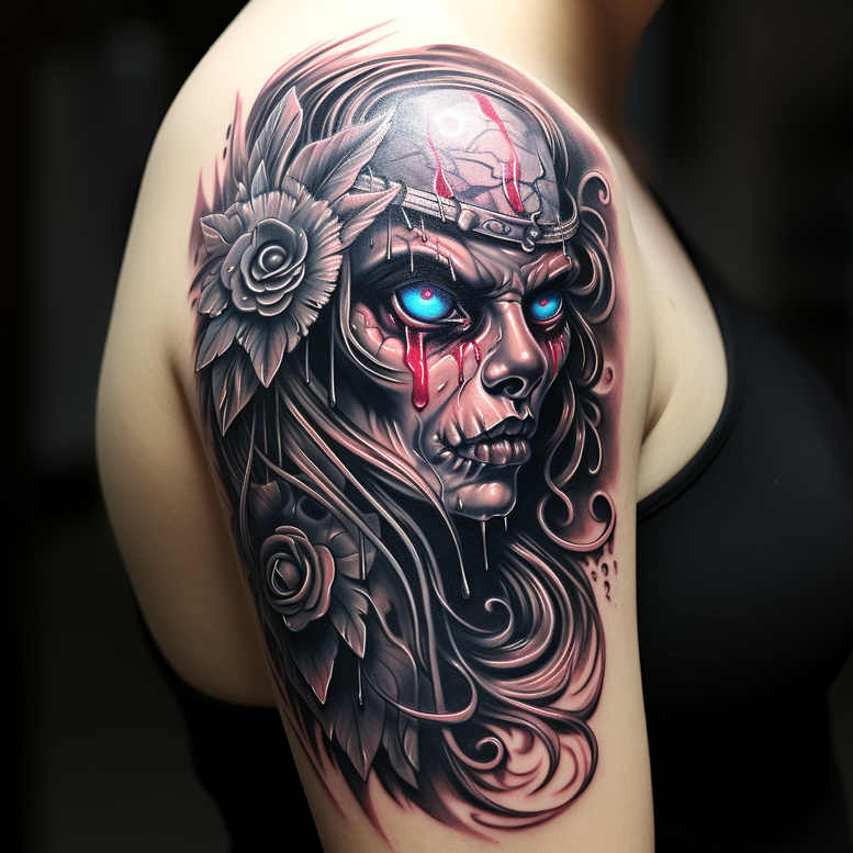 This piece presents a dark Gothic skull portrait rendered in black and grey with meticulous shading and highlight work. The central figure is a skull-faced woman whose expression is both regal and haunted, with luminous cobalt-blue eyes that seem to glow against the monochrome palette. A slim metal headband sits across the forehead, catching light, while tears of crimson bleed down the cheeks, creating a visceral counterpoint to the soft gradients of skin and bone. Ornamental swirls, curls, and strands of hair weave through the composition, merging with two roses and a large bloom near the temple to form a continuous flow of linework that wraps the upper arm. The technique relies on high-contrast black ink, deliberate midtones, and fine-line detailing to sculpt a three-dimensional effect, from the subtle texture of the skin to the gleam in the eyes. The flowers introduce a lyrical counterbalance to the intensity of the skull, their petals rendered with careful shading to convey depth and realism. The overall design is dense but cohesive, designed to follow the arm’s contours and to read as a single, sleeve-ready tattoo design. The motif invites contemplation of mortality and beauty, with the skull representing endurance, the roses symbolizing transformation, and the flowing hair and patterns suggesting movement and memory. The piece embodies a realistic black-and-grey approach, yet the blue accent in the eyes and the red tears inject color that heightens focal drama. As a large, highly detailed piece, it serves as a strong candidate for a cover-up, should the client wish to obscure older work; the density, contrast, and pattern-rich linework enable effective blending and repurposing of existing ink. While the project is AI-generated, the composition and shading reflect professional tattoo artistry principles—clear edge definition, careful line weight variation, smooth gradients, and judicious use of negative space—crafted to meet the standards of body art portfolios and editorial showcases. In terms of SEO, the description integrates keywords such as tattoo, tattoo design, meaningful tattoos, fine line tattoo, rose tattoo design, lotus flower tattoo, infinity tattoo, tribal tattoo, Japanese style tattoo, black and grey, realistic tattoo, body art, and ink, ensuring discoverability for readers seeking black-and-grey realism, floral elements, and dramatic portrait tattoos.