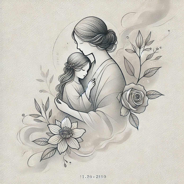 AI-generated tattoo project concept presents a tender scene in black and grey line work: a woman embraces a child, their profiles defined by clean contours, while a bouquet of rose and lily flowers and scattered leaves threads around them, creating a balanced, flowing composition. The piece relies on fine line tattoo technique, with delicate outlines, subtle shading, and soft gradations that suggest depth without heavy saturation, making it adaptable to small or larger canvases. The couplet of flowers acts as visual metaphor for enduring love, renewal, and memory, with the rose symbolizing affection and resilience and the lily evoking purity and new beginnings. The composition draws on influences from Japanese style tattoo precision and modern minimalism, delivering a timeless aesthetic that works well on forearms, shoulders, backs, or chest panels. This tattoo design concept is ideal for clients seeking a meaningful narrative expressed through floral elements—flower tattoos that remain elegant in black and grey, with the opportunity to extend or simplify the bouquet to suit the chosen area. As a custom tattoo design, it invites adjustments in line weight, shading density, and scale, preserving the tenderness of the moment while ensuring readability of the portraits and botanicals on skin. In terms of target keywords, the piece aligns with tattoo design, meaningful tattoos, fine line tattoo, rose tattoo design, flower tattoos, custom tattoo design, black and grey, realistic tattoo, ink, and body art, while acknowledging its AI-generated origin as a starting point for designers exploring ink and composition. The soft, flowing lines and botanical framing offer a versatile template for personal storytelling and have broad appeal to fans of floral tattoos, small tattoos, and fine-line portraits in black ink.