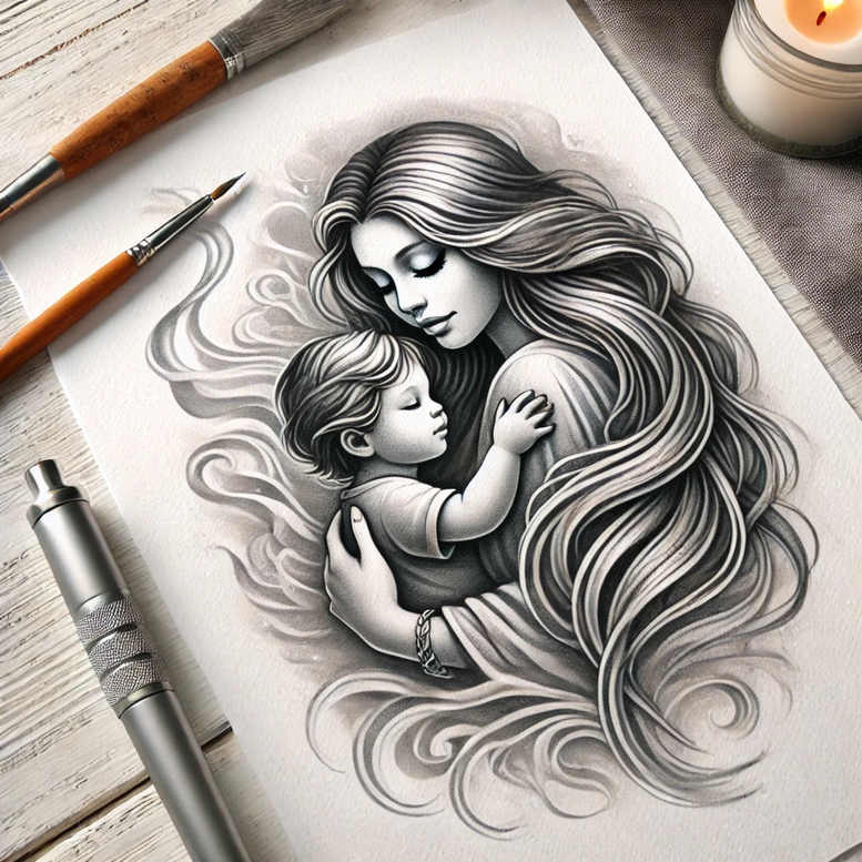An AI-generated tattoo project concept depicting a mother tenderly cradling her child in a flowing grayscale composition. Rendered in black and grey with fine line technique, the design uses meticulous line work and soft shading to sculpt faces, hands, and hair into a cohesive, emotive scene. The mother’s gaze lowers toward the child as the child rests against her chest, a universal symbol of protection, nurture, and bond. The long waves of hair curl around the figures, creating a gentle frame that guides the eye and adds motion without sacrificing clarity for a potential tattoo. Subtle background elements—an unfocused blur of lines suggesting wind, a candle glow, and glimpses of studio tools—signal this as a concept ready for translation into skin. This tattoo design suits small to medium placements, from inner forearm to shoulder blade, and can be scaled up for a larger piece if desired. From a symbolism standpoint, the piece embodies unconditional love, familial connection, and continuity across generations, making it a meaningful choice for meaningful tattoos and custom tattoo design portfolios. For artists, the composition challenges line precision and shading balance, offering an opportunity to blend Japanese-style attention to detail with Western realism in black and grey ink. As an AI-generated concept, it demonstrates how digital workflows inform contemporary body art, inviting interpretation and personalization in line with current tattoo trends: fine line tattoo, realistic tattoo, and meaningful tattoos while maintaining a timeless, intimate narrative.
