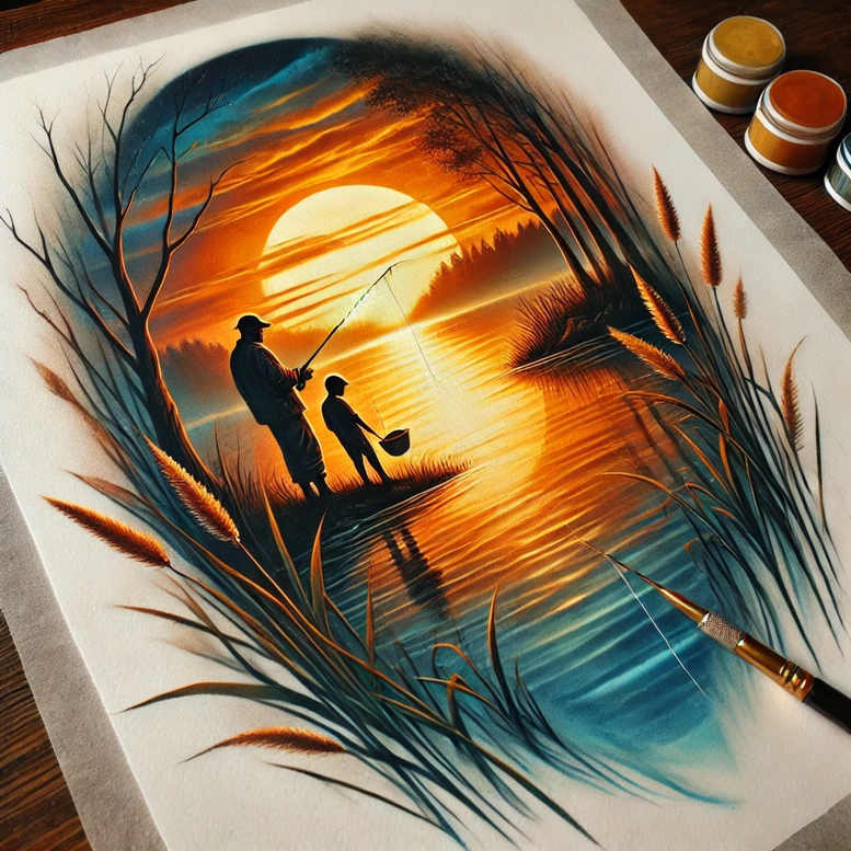 An AI-generated tattoo project concept presented in a watercolor-inspired scene: two silhouettes stand at the edge of a lake at sunset, one adult fishing and one child with a bucket. The blazing sun sinks toward the horizon, its golden light reflected on the rippling water, while reeds bend in the foreground and a cluster of trees frames the composition with a dark, natural perimeter. The soft gradient washes blend seamlessly into crisp black silhouettes, creating a bold contrast that translates well to skin. The balance between painterly color and solid negative space gives this design a versatile footprint for placement on the forearm, calf, back, or shoulder, and allows for size adjustment without losing impact. In tattoo terms, the motif speaks of mentorship, shared patience, and the quiet rituals of everyday life, inviting a personal interpretation of growth and guidance. Although rendered with watercolor-like techniques, the silhouettes provide clear readability for a reliable transfer, with room for additional line work or shading if desired. This concept can be realized as a large, statement piece or as a smaller, restrained work while preserving mood and symbolism. As an AI-generated tattoo project, it demonstrates how digital renderings can inform a custom tattoo design, offering a vibrant alternative to strict black-and-grey palettes while remaining adaptable to different skin tones and placements. Keywords woven into the concept include tattoo, tattoo design, meaningful tattoos, fine line tattoo, lotus flower tattoo, infinity tattoo, tribal tattoo, rose tattoo design, small tattoos, flower tattoos, custom tattoo design, Japanese style tattoo, black and grey, realistic tattoo, body art, ink.