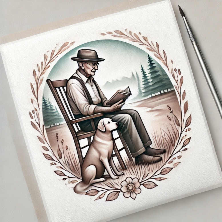 An elegant black-and-grey tattoo concept rendered in a precise fine-line style. The central tableau shows an elderly man in a fedora and vest seated on a wooden chair, absorbed in a book, while a calm dog rests at his feet. The composition is enclosed by a circular floral border, with a blossom anchoring the base, creating a self-contained emblem that works as a forearm, calf, or shoulder piece. The landscape behind the figures offers distant mountains, pine trees, and grasses, but is kept subdued to preserve legibility of the ink. The line work emphasizes clean contours and subtle shading, allowing the scene to read as both portrait and narrative, a hallmark of modern tattoo design that favors storytelling within a compact footprint. The border pattern provides a decorative rhythm that unifies all elements while providing strong contrast for longevity of the tattoo. Symbolically, the design evokes wisdom, companionship, and the passage of time—themes that resonate with healing, resilience, and personal memory. The floral frame functions as a graphic pattern, enabling easy adaptation to sleeve or back pieces while preserving clarity when scaled. From a technical standpoint, this concept relies on crisp linework, careful gradient shading, and balanced negative space to maintain readability on different skin tones; it is suitable for both black-and-grey and full-color experiments if desired. Note: this is an AI-generated tattoo project, reflecting contemporary digital design workflows yet ready for traditional ink applications by a skilled artist. The motif aligns with fine line tattoo and flower tattoo design traditions, while also appealing to clients seeking meaningful tattoos with a subtle, timeless aesthetic. For those considering small tattoos or larger pieces, this piece offers flexibility, with the circular frame acting as a strong focal anchor that can be extended into Japanese style tattoo influences or classic realistic body art depending on client preference. In its essence, the design celebrates everyday wisdom and companionship, inviting a story that can be personalized with names, dates, or symbolic motifs reminiscent of heirlooms and heirloom-like keepsakes.