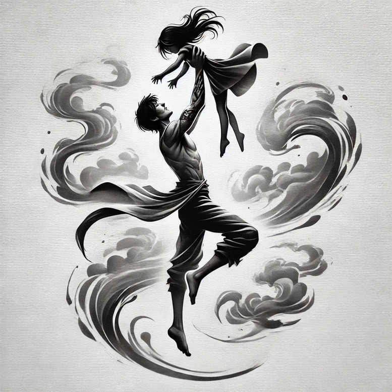 An AI-generated tattoo project presenting a grayscale scene of a muscular man lifting a woman, set against sweeping cloud-like swirls. The composition blends dynamic motion with controlled shading, using black and grey ink to build depth and contrast. The man’s powerful stance and the woman’s elevated profile convey ascent, support, and partnership, while the billowing fabric and smoky ribbons weave a kinetic frame around the central figures. Cloud-like motifs function as a graphic pattern that enhances rhythm without overpowering the figures, offering a bold yet elegant solution for larger canvases. Technique emphasizes smooth gradient transitions, crisp linework, and careful edge control to achieve a painterly feel within the constraints of tattoo ink. The design nods to Japanese style tattoo aesthetics and modern realistic tendencies, while remaining adaptable to fine line tattoo or larger black-and-grey compositions depending on client preference. Symbolically, it speaks to trust, resilience, and shared aspiration, making it a meaningful tattoo design for couples, milestones, or personal growth. In practical terms, this piece is versatile for chest, back, or thigh placements and scales well from medium to large sizes; its pattern elements and negative space help maintain readability over time. As with many AI-generated tattoo projects, it demonstrates how digital tools can inform custom tattoo design while preserving the tactile, analog feel of ink on skin. For collectors seeking a groundbreaking, narrative-driven body art piece, this design provides a compelling blend of motion, pattern, and gravitas; and because of its very dark execution, it doubles as an excellent cover-up option, capable of concealing previous work while delivering a fresh, bold story.