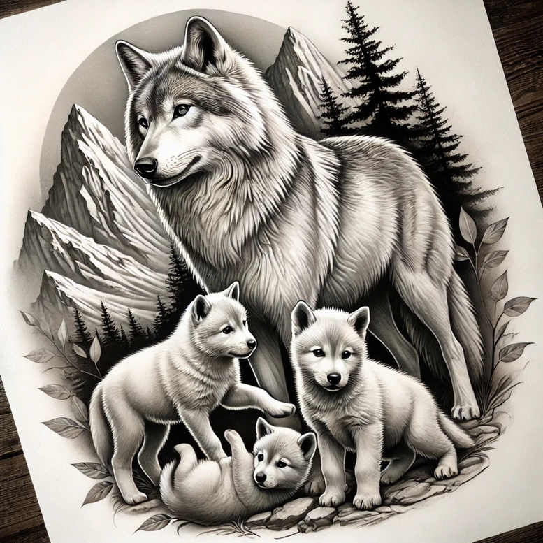 An AI-generated tattoo project concept rendered in black and grey realism, this design presents a protective wolf matriarch or alpha with three cubs gathered at her feet, framed by a rugged mountainscape and sparse pines. The composition centers the adult wolf as the dominant figure, its head turned slightly as if watching over the pups, whose rounded bodies and curious poses soften the scene. The background features jagged mountain peaks and slender evergreens, providing depth and a sense of wilderness that anchors the piece in a natural, timeless motif. The shading is executed with smooth gradient transitions and crisp linework to delineate fur texture: the long guard hairs along the back of the adult, the fluffy undercoat on the pups, and the subtle whiskers and facial features that convey alertness and tenderness. The overall effect is a balanced black and grey tattoo design that reads well on a sizeable area, with tonal contrasts guiding the eye from the foreground to the distant peaks. The piece is well-suited for a back or shoulder canvas, though its strong silhouette would also anchor forearm or calf placements. The symbolism centers on family, protection, and instinctive kinship—wolves embody loyalty and endurance, while the pup pairings evoke nurture and play. For collectors seeking a meaningful tattoo, this composition blends wildlife realism with timeless natural scenery; it pairs effectively with other elements such as a lotus flower tattoo design or a trailing infinity tattoo motif for larger narratives. It also demonstrates how a highly detailed grayscale rendering can achieve depth and motion without color, fitting both modern and traditional aesthetics. As an AI-generated tattoo project concept, it showcases how algorithmic inspiration can produce sophisticated, professional body art ideas that translate well into custom tattoo design, ink aesthetics, and a striking black and grey palette. If the client is considering a cover-up, the high-contrast silhouette and densely shaded fur deliver excellent coverage potential, while preserving essential details that can be reimagined for a fresh tattoo design. The proposed layout can be adapted to Japanese style tattoo influences or more contemporary approaches depending on skin tone, placement, and line thickness preferences, ensuring a durable, timeless piece that remains legible over decades of wear. In sum, this wolf family scene stands as a versatile, meaningful tattoo design shaped by realism, natural motifs, and careful shading to express protection, kinship, and wilderness spirit in ink.