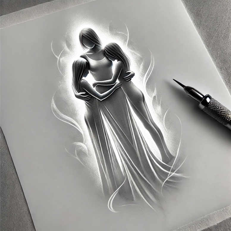 This concept presents three grayscale female figures in a close embrace, rendered with soft edges and subtle value shifts that mimic pencil and charcoal textures. The composition sits on a blank sheet, with a precision pen resting near the edge, signaling the transitional moment between idea and ink. The silhouettes are streamlined rather than strictly realistic, relying on elegant line work and breath of negative space to convey intimacy, support, and resilience. The central idea is connection—family, friendship, or chosen kinship—expressed through entwined arms, flowing robes, and a luminous halo that traces the outer contours and lends a dreamlike quality. The monochrome palette emphasizes black and grey shading, allowing smooth gradients and crisp outlines to coexist without overwhelming the eye, a hallmark of fine line tattoo design. As a tattoo concept, it offers flexibility: the figures can be adjusted in size or number, additional motifs such as lotus flower, infinity symbol, or floral accents can be appended, and the level of detail can be tuned to suit small tattoos or larger canvases. The piece leans into timeless symbolism—three figures sharing warmth evokes protection, memory, and unity—making it apt for meaningful tattoos that carry personal significance. Since this is an AI-generated tattoo project concept, it demonstrates how digital rendering can translate a narrative into clear blueprint lines suitable for a tattoo artist to refine. For prospective clients curious about cover-ups, the soft contrasts and clean silhouette provide room to blend or overlay existing ink through adjusted line weight and shading, though the piece remains legible and stylistically cohesive as a standalone tattoo design. In practice, the concept can be realized in various styles—from Japanese-inspired linework to more understated black and grey realism—while maintaining readability at reduced scales and preserving the integrity of the embrace. The result is a versatile body art concept suitable for commissions, pre-sketch approvals, and as a starting point for custom tattoo design, with the potential to evolve into a larger sleeve or back piece. Keywords such as tattoo, tattoo design, meaningful tattoos, fine line tattoo, lotus flower tattoo, infinity tattoo, tribal tattoo, rose tattoo design, small tattoos, flower tattoos, custom tattoo design, Japanese style tattoo, black and grey, realistic tattoo, body art, ink anchor the concept for search and editorial use.