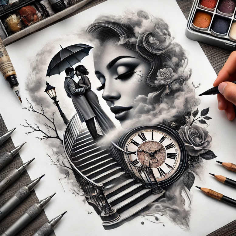 An AI-generated tattoo project concept rendered in black and grey, weaving time, memory and romance into a singular, cinematic composition. The central visage is a woman’s profile with soft, smoky shading that blends into a clouded background; a delicate clock sits on a curved staircase, its roman numerals and inner dial rendered with crisp line work. A silhouetted couple stands beneath an umbrella on the steps, suggesting a moment suspended between love and weathering change. Surrounding elements—roses in bloom, wispy clouds, gnarled branches—frame the scene and anchor the design in natural symbolism. The sheet of drawing paper and the surrounding tools (pencils, pens, a palette) emphasize this as a concept sketch, a tattoo project idea rather than a finished skin image. The composition uses contrast and gradient shading to create depth: the woman’s features emerge through subtle tonal shifts, while the staircase curves around the clock, guiding the eye in a clockwise arc. The interplay of light and shadow conveys mood and narrative: time as a guiding force, memory as something to be preserved, and love as a sheltering motif. In terms of technique, the design leans toward realism with refined line accents and soft transitions between elements, suitable for a large or medium-format body arc, and adaptable to a range of skin tones. For tattooing, the piece offers strong negative space opportunities and clear focal points, and the dense blacks make it an excellent candidate for a cover-up if applied over an existing tattoo. This concept aligns with notes on meaningful tattoos and classic motifs, including black and grey realism, rose tattoo design, and floral elements, while also nodding to broader styles such as Japanese-inspired, tribal or fine-line approaches, should the client opt for tweaks. As an AI-generated tattoo project, it demonstrates how surreal storytelling can be translated into wearable body art that remains legible and impactful on skin, using ink to render a timeless meditation on life, time, love, and renewal.