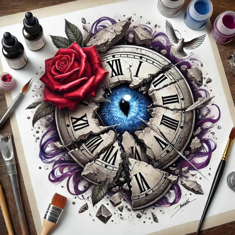 Timekeeper Eye with a Crimson Rose Clock tattoo design is presented as a hyper-realistic, color-saturated concept that blends symbolic motifs into a single body art narrative. The central feature is a fractured vintage clock whose circular rim bears bold Roman numerals; at its heart sits a piercing blue iris that seems to gaze outward, as if time itself could be read in its depth. The left side is anchored by a vivid crimson rose whose velvety petals curl toward the dial, contrasting the cool blue and gray shards. Purple ribbons weave through the composition, linking the elements and giving the piece a dynamic sense of motion. The combination invites interpretation: time as perception, the beauty and fragility of moments, memory’s endurance. The technical approach emphasizes realism with smooth gradients, crisp edge definition, and meticulous shading to render the eye’s texture, the rose’s petals, and the clock’s weathered surface. The shattered fragments around the dial create a graphic pattern that adds drama and energy, while green leaves frame the composition and provide natural contrast against the metallic clock face. Lush color work integrates red, blue, gray, purple, and touches of green to achieve a vivid, tattoo-ready palette; the design suits a large placement such as the upper arm, back, or chest, and can be adapted to smaller scales as a refined, fine-line tattoo or bold full-color work. This AI-generated tattoo project concept offers a rich source of symbolism for meaningful tattoos, rose tattoo design fans, and those seeking custom tattoo design ideas; it nods to Japanese style tattoo influences, and can be realized in black and grey or vibrant color depending on client preference. In short, the design merges time, vision, and nature into a narrative that translates well into classic tattoo formats, contemporary realism, and tribal-inspired interpretations, with ink-ready precision for a lasting impression.