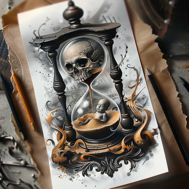 This AI-generated tattoo project presents a dark, meticulously rendered hourglass in grayscale, with a skull looming from the upper chamber and a tiny infant resting in sand within the lower chamber. The composition is anchored by a carved, baroque frame that braces the central motif while decorative scrollwork curls around the base, creating a contrast between mortality and renewal. The grayscale rendering relies on nuanced shading, smooth gradations of black and grey, crisp linework, and subtle texture to convey volume and tactile detail—from the weathered bone of the skull to the grainy surface of the sand. The baby figure is stylized yet serene, serving as a symbol of innocence against the inexorable march of time, while the hourglass visualizes time as a finite, precious resource. This tattoo design leans toward realism, emphasizing three-dimensionality, dramatic lighting, and controlled splatter textures to suggest movement of ink. The ornate patterns at the base function as graphic flourishes that frame the central image, guide the eye, and enhance readability. When considered as a meaningful tattoo, the piece invites reflection on life, mortality, and memory, adaptable for a cover-up or as a bold black and grey statement. The composition scales well for larger canvases or can be tightened for a compact forearm or calf piece without losing legibility of the skull, hourglass, and baby motif. As an AI-generated tattoo project, it demonstrates how digital artistry can translate into skin-ready line work and shading, with room for adjustments to line weight, contrast, and scale to suit individual tastes. Given its dense grayscale palette and strong silhouettes, it is especially suitable as a cover-up option for older ink, while the decorative pattern elements can be tuned to soften or intensify the mood. In sum, the concept blends time-honored symbolism with contemporary realism, offering a powerful canvas for meaningful tattoos, fine line touches, and tattoo design enthusiasts seeking a distinctive black and grey piece.
