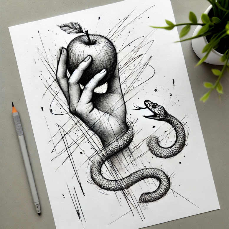 AI-generated tattoo project presented as a refined study in black and grey linework, this concept pairs a human hand gripping an apple with a serpentine coil that winds along the forearm. The hand anchors the composition with precise contouring of fingers, knuckles, and thumb, while the apple provides a compact focal point rendered with soft shading to suggest a smooth texture. The snake threads beneath and around the fruit, its scales hinted with careful stippling and cross-hatching to create depth without sacrificing the bold, graphic crispness that defines fine line tattoo style. A dynamic background of diagonal scribbles and ink splashes adds energy, guiding the eye through the piece without competing with the central motifs. The result is a versatile tattoo design concept that translates well to small or medium placements, including forearms, wrists, or wraparound sleeves where the snake’s curve can follow the anatomy. The work balances realism with illustration, featuring clean outlines, restrained shading, and deliberate negative space to keep legibility as ink ages. Symbolically, the hand can signify control or choice, the apple evokes temptation or knowledge, and the snake suggests transformation or rebirth—meanings the wearer can personalize. As an AI-generated tattoo project, it demonstrates how algorithmic sketches can be refined into meaningful, market-ready ideas for clients seeking contemporary black and grey designs. This description embraces a modern tattoo design ethos where meaning, technique, and style converge: fine line work, black and grey ink, and the potential for a striking small-to-mid sized tattoo that remains clear and expressive. The pattern-like background accents reinforce a dynamic, contemporary edge, making the concept suitable for studios and galleries that value thoughtful body art and unique tattoo design inspiration.