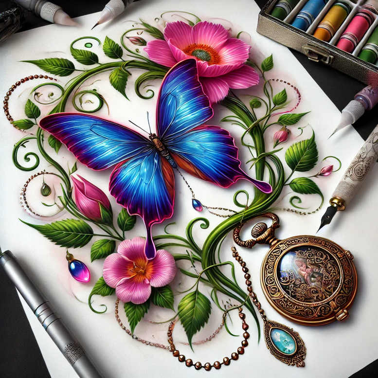 These AI-generated tattoo projects present a vibrant concept that blends natural symbolism with ornamental jewelry. The central motif is a cobalt-blue butterfly with wings painted in electric cerulean and magenta shading, perched among hibiscus blooms in saturated pinks while green vines weave through the composition. An ornate pocket watch rests at the base, its case rich with filigree and a tiny reflective jewel pendant dangling from a chain, all rendered in luminous full color. The technique evokes a watercolor tattoo approach: soft edge transitions, subtle bleeding of color into skin, crisp fine-line outlines for the botanical details, and bold color blocks to preserve readability at larger scales. The pattern of the vines and petals creates a cohesive rhythm that guides the eye around the artwork. The butterfly signifies transformation and resilience; hibiscus suggests beauty and fleeting life; the watch implies time’s inexorable flow, balancing motion with stillness as the vines spiral to connect each element. The piece reads as a cohesive narrative rather than isolated motifs, with the watch acting as a grounding anchor and the snake-like vines guiding the gaze around the artwork. In practice, this concept adapts to a range of sizes—from small pieces that emphasize the butterfly’s silhouette to large panels where shading and contouring bring depth to the petals and metalwork. For collectors seeking meaningful tattoos, the combination of flora, fauna, and timepiece offers a timeless symbolism: metamorphosis, growth, memory, and legacy, all expressed in a contemporary full-color style that nods to floral Japanese- and nature-inspired tattoo traditions, yet remains accessible as a modern body art piece. While the composition is richly detailed, its clean lines and distinct shapes support potential cover-up planning by reworking dark areas beneath with lighter layers and seamless transitions; this makes it a practical AI-generated tattoo project for artists drafting custom tattoo design concepts and clients exploring expressive, vibrant body art.