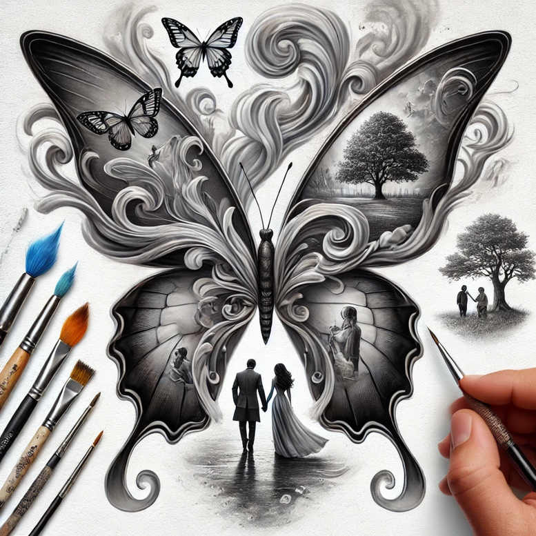 This is an AI-generated tattoo design concept featuring a grayscale butterfly whose expansive wings cradle a narrative scene. The central body acts as a hinge between two wing panels, guiding the eye toward a couple standing hand in hand on a reflective surface that suggests water or glass. Inside each wing, curling wisps and stylized scrolls form an ornamental pattern that blends natural forms with surreal motion, while distant silhouettes of trees add a quiet, contemplative backdrop. On the left, a cluster of painting brushes hints at the artist’s hand shaping the piece, reinforcing the meta idea of tattoo design as an evolving artwork. The composition relies on black and grey shading to create depth, contrast, and a photorealistic texture across scales, resulting in a tattoo that reads as both romance and metamorphosis. The motifs invite personal storytelling: the couple can symbolize union, memory, or transformation, while the butterfly suggests change and resilience. The black and grey palette allows for strong contrast on a range of skin tones, making it suitable for larger placements or as a cover-up to conceal an older tattoo beneath the winged design. In terms of technique, the artist emulates fine-line precision, smooth gradient transitions, and crisp linework to render the wing edges, the landscape vignette inside the wings, and the reflective base with convincing light. As an AI-generated tattoo project, it demonstrates how digital-driven concepts can translate into meaningful body art, while maintaining the flexibility to adjust scale, placement, and line density for a personal tattoo design. This cover-up-ready, pattern-rich composition embodies a blend of dreamlike imagery and precise technique, making it a versatile foundation for a personalized piece that preserves memory while embracing metamorphosis.