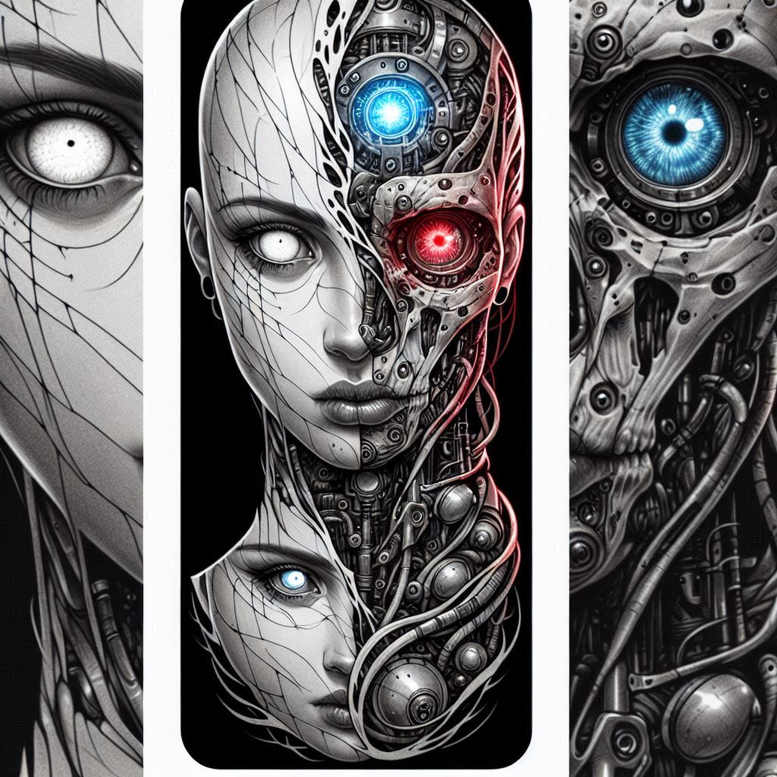 This AI-generated tattoo project showcases a three-panel, black-and-grey cyborg portrait that bridges portrait realism and biomechanical fantasy. The central panel presents a human face that gradually yields to an engineered exterior of gears, plates, micro-wiring, and threaded components, while both side panels extend the motif with cracked skin lines merging into cables and piston-like structures. The eyes glow with cobalt blue and crimson cores, creating a dual focal point that suggests perception enhanced by machine intellect. The line work is meticulous and fine, producing crisp outlines, soft gradations, and a tactile sense of metal texture. The contrast between smooth skin tones and dense machinery invites close study, even as the overall silhouette remains legible when seen from a distance—an important consideration for tattoo longevity. The composition uses a triptych layout to guide the viewer along a narrative arc: human identity blending into cybernetic augmentation, a theme common to meaningful tattoos and the broader discourse of body art. From a technical perspective, the design relies on black and grey shading, negative space, and micro-patterning to simulate chrome, rivets, and cable braids, while the blue and red LED accents provide dramatic pops without overwhelming the monochrome palette. As a cover-up-friendly concept, the dense machinery can be integrated with an existing tattoo, disguising older marks beneath the circuitry so that the new image appears seamless. This project embraces contemporary tattoo trends such as fine line precision, realistic shading, and graphic patterning, while remaining adaptable to different skin tones and placements. The AI-generative process adds a layer of futurist symbolism, evoking themes of transformation, memory, and identity, and offering potential paths for future customization in Japanese-style precision, technology-inspired motifs, or lotus- and infinity-themed variations. In sum, this is a highly detailed, black-and-grey tattoo design that reads as both portrait and mechanism, ideal for fans of pattern-rich, small-to-medium sized body art and for collectors seeking a bold, meaningful tattoo that can also function as a cover-up if needed.