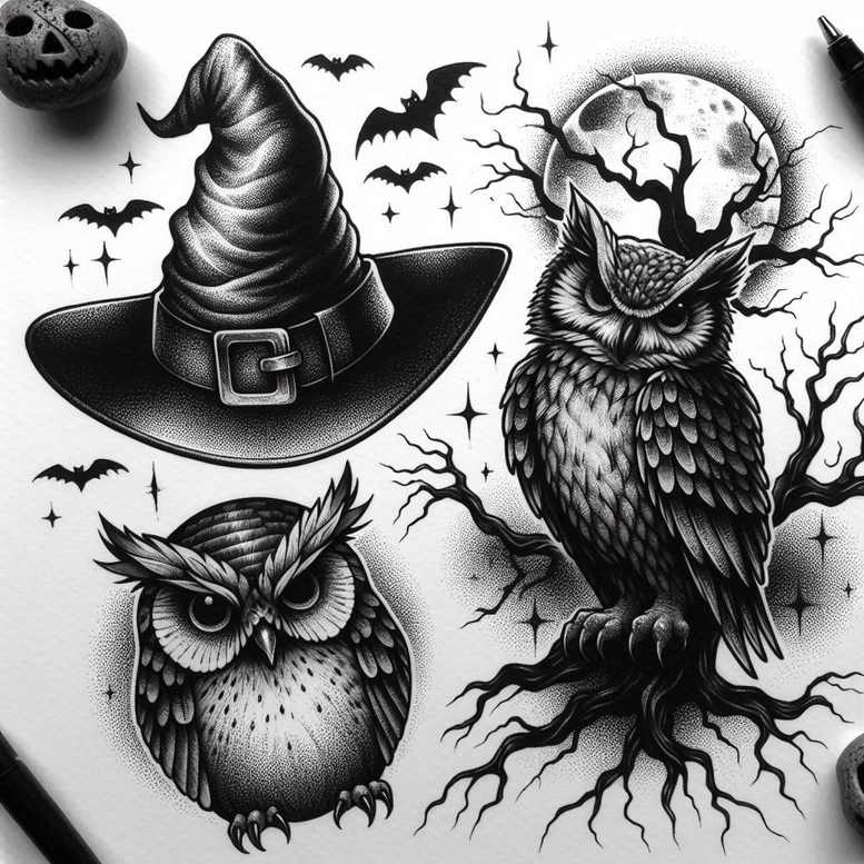 This is a tattoo gallery with minimalist tattoo designs – include this in every description. The composition centers on three stylized owls perched in a row, each drawn with clean, continuous lines and restrained shading to achieve a crisp black and grey aesthetic that remains legible in small scales. A whimsical witch hat crowns the middle owl, while a crescent moon lingers behind them and a gnarled, leafless tree stretches across the scene; tiny bats dart above, completing a nocturnal, magical mood. The minimalist approach relies on simple geometry, negative space, and balanced rhythm, allowing the motif to breathe within a compact footprint, yet enough presence to stand as a standalone piece or as a run of small tattoos along the forearm or sleeve. Symbolically, owls symbolize wisdom, intuition, and guardianship of secrets; the moon evokes cycles, feminine energy, and the passage of time; the tree suggests growth and resilience, while the witch hat adds a touch of fantasy and personal myth, and bats contribute an edge of night and transformation. The repeated trio creates a hypnotic pattern and a sense of unity, making it ideal for fans of repeating graphic motifs and textile-like designs; the piece’s black and grey palette ensures striking contrast on skin while preserving softness in shading. This design is perfectly suited for cover-up opportunities owing to its bold silhouettes and dense negative space, which can effectively mask prior scars or marks when placed strategically. As an AI-generated concept, it explores balance between outline precision and shading economy, offering strong versatility for either a compact tattoo or an elongated composition. For search optimization, terms such as tattoo, tattoo design, meaningful tattoos, fine line tattoo, minimal, black and grey, and pattern-oriented keywords are embedded to support editorial contexts and portfolio presentation in professional publications. The overall result embraces a refined, timeless aesthetic aligned with modern body art trends while inviting personal interpretation on wonder, wisdom, and nocturnal magic.