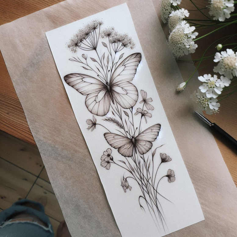 This image belongs to a tattoo gallery with minimalist tattoo designs, presenting a refined black-and-grey composition where a vertical stem carries blossoms and two delicate butterflies. The lines are restrained and precise, capturing the essence of fine-line work while maintaining clarity at small scales, making it ideal for a discreet arm, wrist, or collarbone placement. The design plays with negative space, allowing the skin to become part of the artwork and ensuring the piece remains legible as it ages. The butterflies, rendered with gentle curves and light shading, symbolize metamorphosis, transformation, and the arrival at a new phase of life, while the blossoms evoke growth, renewal, and the beauty of fleeting moments. Together they form a narrative of personal change, resilience, and the quiet strength found in nature-inspired tattoo designs. The vertical composition guides the eye along the spine, forearm, or calf, suggesting movement and a sense of balance. This concept embraces the minimal aesthetic while offering opportunities for customization in line weight, scale, and detail density, making it a versatile choice for a custom tattoo design. The work is presented as a concept and can be adjusted for size, placement, and skin tone; if inked, it would age gracefully under black and grey shading, highlighting the crisp linework and subtle shading. In the context of tattoo history, fine-line and minimalist pieces celebrate restraint and clarity, aligning with contemporary trends in real-world body art that favor elegant silhouettes over dense fills. The design is AI-generated as a concept, reflecting current capabilities in AI-assisted art while remaining faithful to a timeless natural motif. For meaningful tattoos, this piece communicates transformation and growth without overpowering the wearer, and it can be extended into a sleeve or integrated with botanical elements for a custom tattoo design. The inclusion of repeating botanical motifs, though understated, enhances rhythm and cohesion, and the overall composition remains legible across sizes.