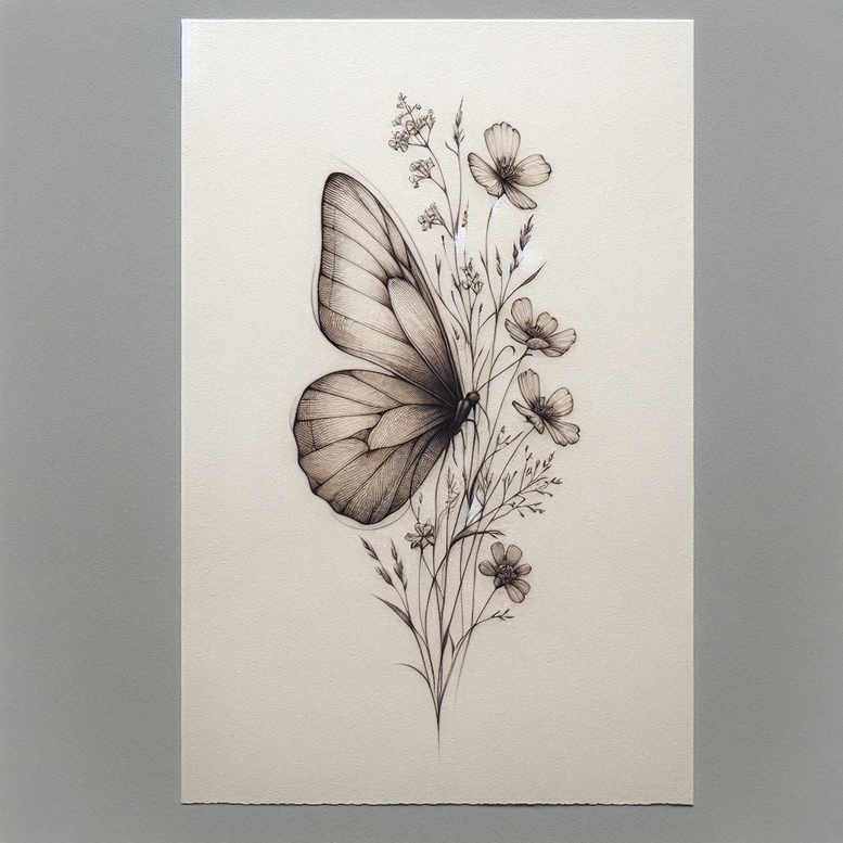 An engraving-like study rendered in black ink, this composition features a large butterfly perched among slender stems and tiny blossoms. The butterfly is drawn with clean, precise outlines and interior vein lines that echo fine-line tattoo technique, while shading is achieved through delicate cross-hatching and micro-stippling to create subtle depth without harsh gradients. Surrounding the insect, vertical grasses and small flowers rise in a natural arc, balancing negative space and guiding the eye from the butterfly’s antennae to the tip of the stem cluster. The overall effect is a refined, nature-inspired tattoo design that translates well to a small-to-medium area such as the forearm, ankle, or collarbone, offering a versatile piece for someone seeking timeless black-and-grey body art. The line work favors clarity and legibility, with a strong silhouette that anchors the scene while internal detailing suggests texture in the butterfly wings and leaf-like foliage. Symbolically, the butterfly represents transformation and renewal, paired with blossoms that speak to growth, resilience, and the fleeting beauty of life—themes commonly chosen in meaningful tattoos and flower tattoo designs. The composition is easily adaptable for variations like a lotus flower tattoo or a minimalist floral motif, and its restrained palette makes it suitable for both classic realism-inspired tattoo work and more stylized interpretations in Japanese-style tattoo conventions. These AI-generated tattoo projects explore a precise delicate aesthetic that suits small tattoos or larger sleeves as the design evolves, and the elemental triad of butterfly, flower, and stem provides a strong foundation for a custom tattoo design that can be refined in black and grey ink, preserving legibility and longevity on the skin.