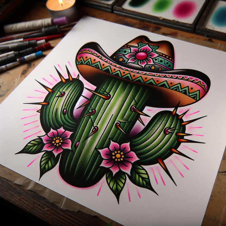This piece belongs to a tattoo gallery with minimalist tattoo designs, and as an AI-generated concept it sits at the crossroads of graphic clarity and decorative detail. The composition centers on a plump cactus rendered in saturated greens, each segment crisp with bold black outlines to preserve legibility as skin ages. A decorative sombrero crowns the plant, its brim patterned with repeating geometric bands that create a subtle rhythm across the design. Pink and magenta blossoms cluster at the base and along a cactus arm, providing vibrant contrast against the green body and contributing a note of life and renewal. The color palette is bold and multi-layered, combining flat color fills with soft shading that hints at depth without sacrificing the clean, poster-like silhouette characteristic of bold-line tattoo aesthetics. In terms of meaning, the cactus embodies resilience, endurance, and the ability to thrive in harsh conditions; the sombrero nods to festivity, culture, and protection—suggesting hospitality and celebration even in a desert landscape. The flowers symbolize beauty, growth, and new beginnings, creating a balance between toughness and tenderness that makes the design emotionally resonant. The repeating patterns on the hat and the segmented body of the cactus give the piece a unified decorative rhythm, making it suitable for various placements, from small forearm tattoos to larger back pieces. This concept embraces the idea of a custom tattoo design that is both striking and meaningful, with shell-like outlines ensuring long-term readability on skin while offering a dynamic canvas for color work. It also hints at a broader trend in modern body art: bold color, graphic linework, and symbolic storytelling, all within a minimalist gallery framework. AI-generated, this design invites clients who seek a wearable symbol of perseverance, joy, and life’s cycles, while remaining versatile enough to adapt to different sizes and skin tones.