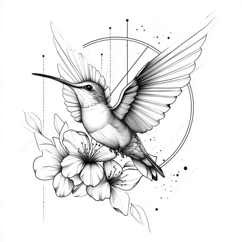 Rendered in crisp black-and-grey line work, this hummingbird and hibiscus tattoo design fuses naturalistic detail with geometric pattern elements for a contemporary body art motif. The central subject is a hummingbird in mid-flight, its wings rendered with fine line technique and subtle shading that suggests motion and texture across the feathers. Beneath the bird, hibiscus blooms unfold with bold petal structure and delicate stippled shading that gives depth without sacrificing the clean look of the line work. A circular arc frames the composition, complemented by vertical darts and scattered dots that create a quiet, modern pattern behind the figure. Leaves extend along the lower edge, balancing the floral mass and enhancing the sense of flow, while negative space around the motif ensures clarity once ink settles. From a technique standpoint, the piece relies on controlled line weights, precise cross-hatching, and careful use of negative space to maximize legibility on the skin, making it suitable for smaller areas like the forearm or collarbone while still reading as a cohesive composition when enlarged. The hummingbird is symbolic of agility and resilience, the hibiscus stands for beauty and tropical warmth, and the circular motif evokes infinity and unity—together they form a meaningful tattoo that blends natural symbolism with a graphic, almost tattoo-flash aesthetic. This description also reflects current trends in fine line tattoo and black-and-grey ink, with a pattern-forward approach that appeals to fans of botanical and geometric body art. As an AI-generated tattoo project, this concept offers a stylish reference for clients seeking meaningful tattoos or a pattern-rich design that can be adapted for custom tattoo design work; while not inherently a cover-up, the layout and contrast can be tailored to accommodate older work if needed. In short, it embodies the balance between botanical realism and modern graphic pattern, making it a versatile option for those pursuing small tattoos with lasting impact, drawing on Japanese-style influence and the broader lexicon of flower tattoos and ink art.