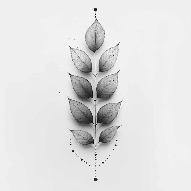 An elegant vertical botanical study rendered in black and grey fine line technique, this tattoo design centers a slender stem with evenly spaced leaves that rise in a measured ladder of natural symmetry. Subtle shading along each leaf creates a gentle gradient, while delicate stippling and a surrounding dotwork motif provide texture and visual rhythm. The composition is intentionally minimalist yet expressive, allowing the form to breathe on the skin and work well as a standalone piece or as part of a larger botanical sleeve. The dot pattern arcs beneath the stem echo the bead-like geometry found in traditional linework designs, giving the piece a refined sense of balance and movement. Executed with high-contrast monochrome ink, it translates well into black and grey tones with precise linework and soft shading, preserving legibility at small sizes or as a focal point on the forearm, calf, or shoulder blade. The leaves symbolize growth, renewal, and resilience, while the vertical alignment conveys steadiness, progress, and intention. For tattoo enthusiasts seeking a meaningful tattoo, this clean, nature-inspired motif offers versatility: it can be extended with additional leaves, flowers, or symbolic elements, or kept as a minimalist single-panel piece. As an AI-generated tattoo project, it showcases how fine line tattoo techniques can capture the elegance of botanical forms without crowding negative space. While influenced by the Japanese style tattoo emphasis on restraint and natural motifs, this design remains broadly accessible to fans of floral ink and geometric interplay. In practice, it suits small tattoos and can be scaled into larger body art, enabling variations such as color shifts to black and grey, or left in pure monochrome for a timeless look. The resulting tattoo design embodies a timeless botanical aesthetic that resonates with lovers of ink, nature, and meaningful symbolism, translating gracefully across skin tones and body placements. In addition, the design translates well to a range of placements and scales, offering a timeless look that pairs with ink styles from traditional blackwork to modern minimalist.
