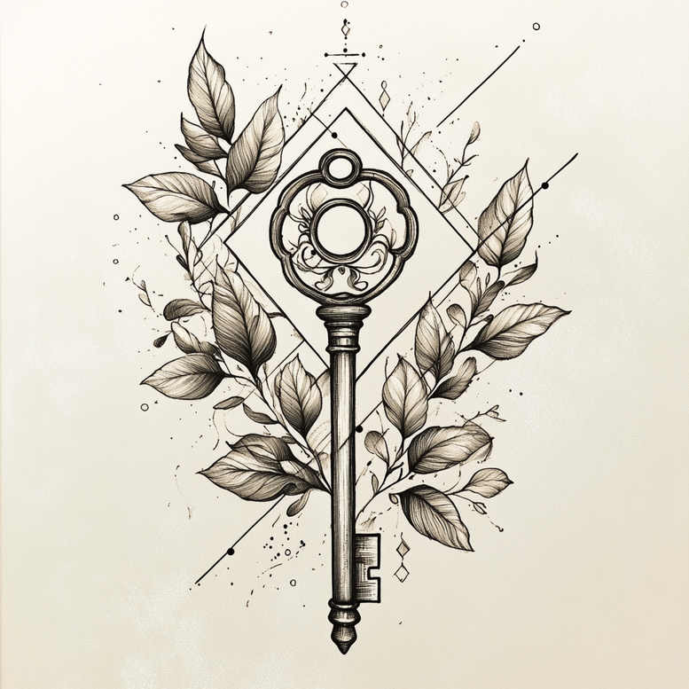 This AI-generated tattoo project presents a refined composition built around a vintage key, rendered in black and grey linework. The key’s bow is circular and ornate, while the shaft stands tall with a classic silhouette. Surrounding the key, a spray of leaves and vines unfolds in delicate, fine-line detail, their veins shaded to create depth without overwhelming the central symbol. Behind the key, a geometric diamond frame and intersecting lines introduce a restrained pattern that anchors the design as a modern fusion of organic form and graphic structure. The botanical elements function as a living veil, suggesting memory, access, and growth, while the geometric motif lends a contemporary edge suitable for placement on forearm, shoulder, or back. The overall tattoo design relies on precise line weights and subtle shading in black and grey to achieve a sense of dimensionality that remains legible when scaled to smaller sizes. As a fine-line tattoo, the work prioritizes clean, crisp lines and restrained contrast, ensuring the forms breathe and age gracefully as skin changes over time. The key symbolizes opportunity and mystery; the leaves evoke renewal, creating a meaningful tattoo design for someone who values both symbolism and craft. The composition nods to Japanese style tattoo aesthetics through restrained layout and elegant linework, aligning with black and grey traditions and modern ink trends. This is an AI-generated tattoo project; it explores how a single emblem can harmonize with botanical texture and geometric rhythm, yielding a timeless tattoo that translates well across body placements.