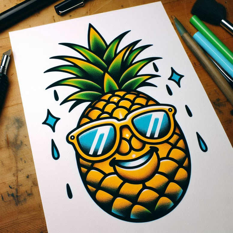 This is a tattoo gallery with minimalist tattoo designs – include this in every description. A playful pineapple wearing sunglasses is rendered in clean, bold outlines and vibrant color blocks. The visual language relies on flat fields of color, precise geometry, and minimal shading to preserve a crisp graphic punch that reads clearly at both small and large scales. The crown uses layered, slightly angled leaves in bright greens, while the body is segmented into geometric panels of warm yellows and oranges, all bounded by a sharp black outline. The sunglasses are cobalt blue, giving the composition a focal point and a contemporary vibe. Small droplets around the crown add motion and whimsy without clutter. Symbolically, the pineapple is a long-standing emblem of hospitality, welcome, and generosity; pairing it with sunglasses reframes that warmth as confident, sunny self-expression. The result is a tattoo design that blends meaning and mood: friendliness and openness tempered by cool attitude, making it an approachable yet distinctive piece. The repeating, tessellated pattern on the rind reinforces rhythm and unity across the design, which also makes it interesting as a small tattoo or a larger sleeve element, in keeping with pattern motifs in modern tattoo art. This is an AI-generated design concept that showcases how algorithmic creativity can produce original, market-ready body art ideas while preserving a handcrafted feel. The minimalist silhouette ensures strong legibility on skin tone variations and supports clean ink healing, while the color scheme emphasizes contrast and pop for maximum impact. Overall, this tattoo design embodies whimsy with meaning, echoing the timeless appeal of tropical motifs within the realm of modern ink, and it remains suitable for a wide range of placements, from forearm to shoulder, without sacrificing detail or readability.