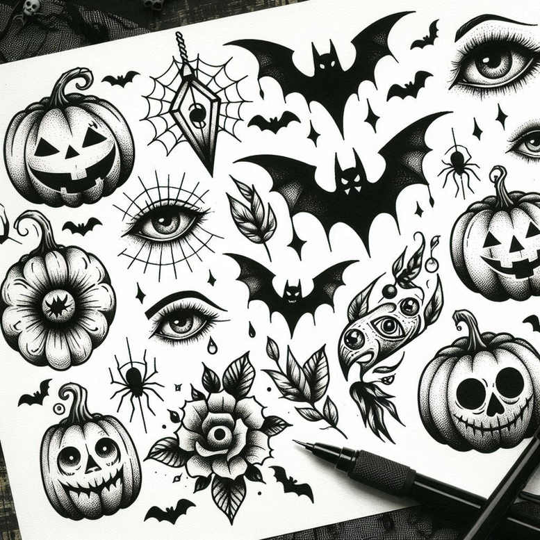 This is a tattoo gallery with minimalist tattoo designs. A black and grey line-art sheet stitches together Halloween symbols and floral motifs into a cohesive, balanced composition. Dominant elements include carved pumpkin heads, stylized skulls, an open eye motif, and fluttering bat silhouettes, anchored by a slender dagger and a blooming flower, while a spider and delicate leaves provide organic counterpoints and a sense of movement. The piece relies on crisp outlines, restrained shading, and fine-line techniques to create depth without dense fill, capturing the feel of classic flash while embracing contemporary minimalism. The repetition of motifs—pumpkin shapes, eye shapes, and vine-like leaves—establishes a subtle pattern across the design, inviting the eye to travel along the curves and negative spaces that separate each element. In terms of meaning, pumpkins evoke harvest, transformation, and cycles of life, while skulls remind us of mortality and impermanence; eyes symbolize perception and awareness; bats symbolize change and transition, often linked to night and mystery; the dagger can signify protection or clarity; flowers convey beauty, renewal, and growth; spiders symbolize fate, weaving connections, and patience; leaves reinforce renewal and the passage of seasons; a moth introduces metamorphosis and the lure of the unknown. Executed in black and grey tones, the overall mood is gothic yet understated, making this design suitable for tattoo lovers seeking a subtle statement rather than bold saturation. As a portfolio concept, this piece embraces minimalism to convey complex symbolism with few lines, ensuring legibility on skin and longevity over time. This AI-generated concept showcases how fine-line tattoo design can render a rich tapestry of motifs with balance and restraint, appropriate for smaller placements or as part of a larger back-to-back sleeve idea. The result is a meaningful tattoo design for those drawn to timeless themes—life, death, and transformation—expressed through a cohesive, repeatable motif palette that works well in black and grey ink.