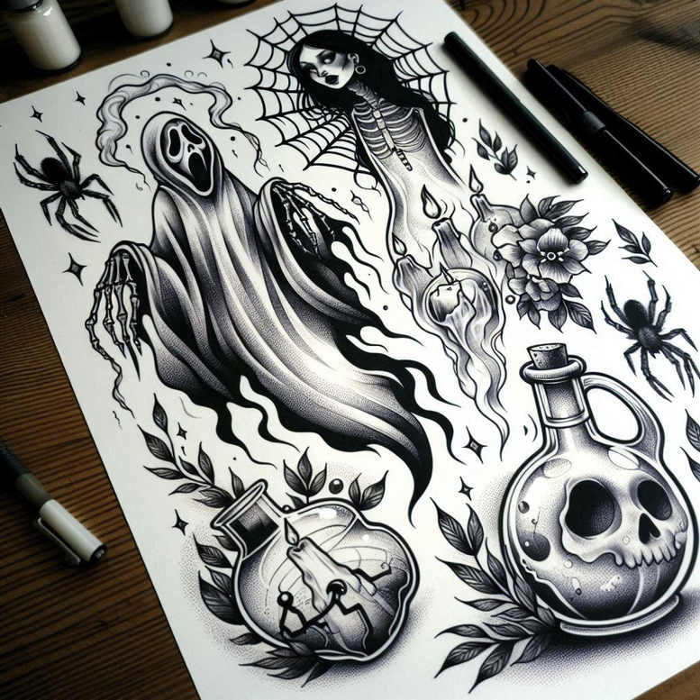This is a tattoo gallery with minimalist tattoo designs. The image presents a black and grey tattoo design centered on a hooded skeleton figure, complemented by a skull, a glass potion bottle, and curling vines that encircle the scene. The lines are crisp, the shading deep, and the overall composition relies on high contrast to create a moody, timeless feel. In terms of symbolism, the skeleton and skull evoke mortality, memory, and the transient nature of life, while the potion bottle suggests transformation, alchemy, and the idea that meaningful change can be brewed from experience. The hooded figure adds an aura of mystery and the unknown, inviting reflection on fate, protection, or the crossing between worlds. The intertwining vines symbolize growth, resilience, and connection, implying that life persists through darkness and that beauty can emerge from hardship. This design is rendered in a compact, illustrative black and grey style with precise line work and tonal gradation, making it well suited for small tattoos or placements where detail matters. The composition tells a cohesive narrative about endings and new beginnings, appealing to those drawn to gothic or neo-traditional motifs, and demonstrates how the skull, bottle, and vines can combine in a single tattoo design to convey a personal story at various sizes. Note: AI-generated concept. The piece features heavy black areas and strong silhouettes, which enhances its suitability for cover-up applications without losing its symbolic weight in the process of artwork adaptation.