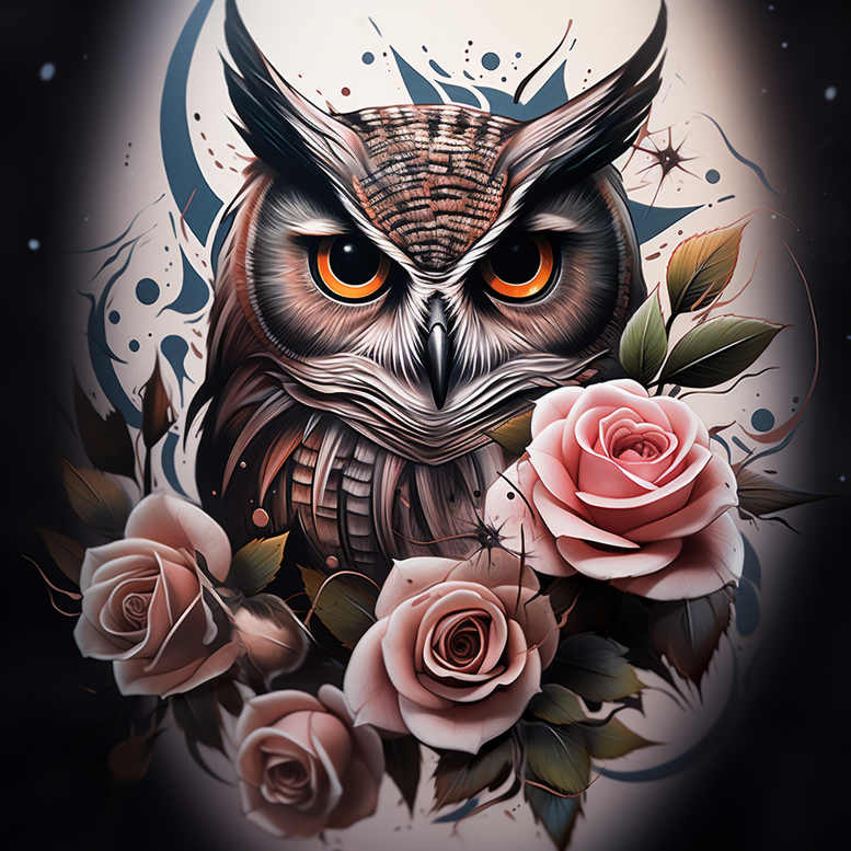 These AI-generated tattoo projects present a dramatic, darkly lit composition that pairs a keenly observed owl head with a cascade of pink roses. The central owl is rendered with meticulous line work and a layered gradient that builds the texture of feathers, from the fine micro-hairs around the beak to the broader wing plumes framing the face. The eyes glow with amber-orange irises, giving a sense of alert intelligence. Surrounding the bird are roses in full color, their petals shaded with delicate transitions from pale pink to deeper rose hues, while green leaves provide a cool counterpoint. A midnight backdrop and subtle splatters create a high-contrast scene that reads as both tattoo-ready and gallery-worthy. Decorative motifs weave through the composition—soft filigree swirls, geometric highlights, and speckled accents—that introduce a graphic pattern element without overpowering the natural subjects. The artwork is designed to be legible on larger canvases like the upper arm, back, or chest, yet retains clear readability if scaled down for smaller placements. Symbolically, the owl conveys wisdom and vigilance, while the roses symbolize love, renewal, and resilience; together they suggest a guarded, hopeful balance. The technique blends realism-inspired shading with bold color saturation, suitable for a full-color or black-and-grey interpretation; the latter can emphasize texture through crosshatching and gradient wash. Because the image leans toward significant darkness, it is particularly well-suited as a cover-up tattoo project, capable of concealing earlier designs while introducing a fresh narrative. This is an AI-generated tattoo project, offered as a source of inspiration for a custom tattoo design, with the potential to adapt to Japanese style influences or contemporary realism. The design also aligns with trends in meaningful tattoos, fine line accents, and floral wildlife motifs, enabling options ranging from small tattoos to large body art. For search clarity, include terms like tattoo design, rose tattoo design, flower tattoos, and ink techniques when briefing a tattooist.