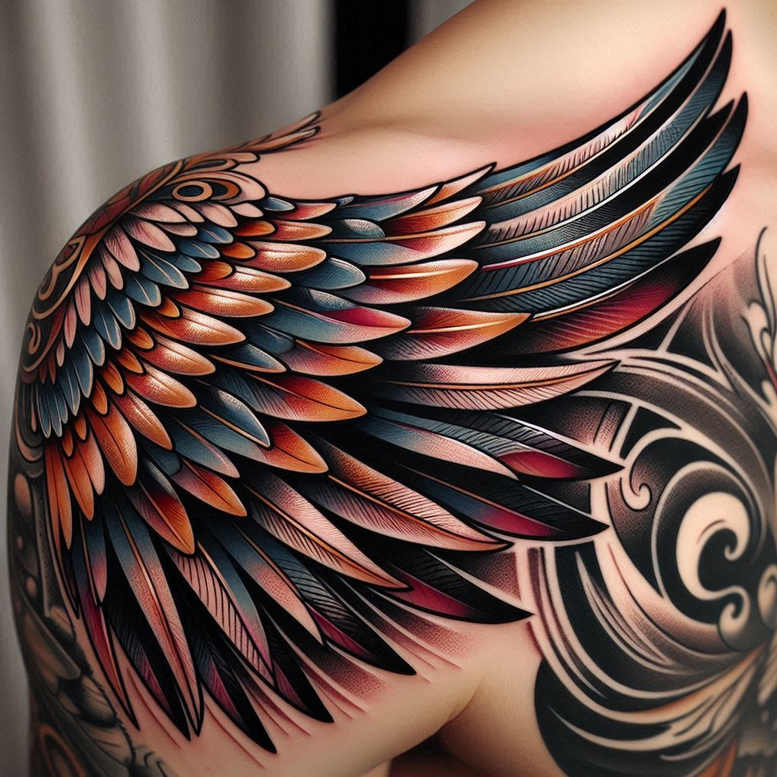 This concept presents a bold wing motif realized as a full-color tattoo, merging precise featherwork with graphic shading and decorative background swirls. The primary element is a sweeping wing composed of dozens of layered feathers: long secondary plumes in a blue-black gradient, warmer reds and oranges toward the inner rows, and crisp white highlights that create depth. Each feather is defined by clean black outlines and subtle hatch marks, giving the design a crisp, graphic quality that reads well from distance and up close. Surrounding the wing, a fluid swirl of ornamental curves provides movement and helps anchor the composition on the shoulder blade and upper arm. The color palette—cobalt blues, burnt oranges, crimson reds, and deep charcoal—produces strong contrast against the skin, while soft shading inside each feather adds volume and realism without flattening the design. The arrangement nods to traditional wing motifs while embracing a contemporary color scheme and pattern repetition, making it attractive to fans of realistic tattoo, neo-traditional, and Japanese style tattoo aesthetics. Although this is presented as a finished project concept, it can be adapted to different body contours, scales, and color priorities, or expanded with elements such as a lotus flower tattoo design or infinity tattoo motifs to convey deeper meaning. The AI origin note is included here to acknowledge that these are AI-generated tattoo projects, offering a modern approach to concepting before the needle. Symbolically, wings evoke ascent, protection, and freedom, while the feather hues symbolize growth and transition, rendering this piece meaningful for those seeking a statement piece or a backdrop for smaller flower tattoos or small tattoos placed on the back or shoulder. In terms of technique, the work demonstrates strong linework, layered shading, and color blocking that supports longevity and legibility, with attention to skin tone, ink saturation, and edge crispness to ensure a durable, eye-catching result. This design also sits well within the scope of custom tattoo design workflows, where artists balance pattern, color, and form to deliver a tattoo design that feels both personal and universal.