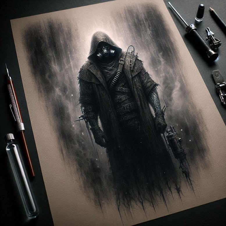 An atmospheric, monochrome concept rendered in a painterly, hyper-real style, this piece centers on a hooded figure in a tattered trench coat, wearing a gas mask and bearing a blade at the side. The composition relies on deep blacks and soft grays to model light and volume, with subtle textures suggesting rain, smoke, leather, and weathered metal. The subject’s anonymity, created by the mask, lends a sense of menace and narrative intrigue, inviting interpretation as a story of survival, rebellion, or vigilante justice. In a tattoo context, the image acts as a strong main piece or a powerful cover-up design due to its bold contrast and dense shading, ideal for large areas such as the back or chest. The surrounding workspace depicted hints at the tattoo process, reinforcing this as a conceptual project rather than a finished work, while also signaling its suitability for translation into skin art via proper line weight and shading choices. The design emphasizes realism and subtle fine-line accents in the creases of the coat, the belt, and the mask’s respirator, offering potential for a high-contrast black and grey tattoo that preserves legibility on aging skin. Meaning-wise, the gas mask suggests guarded identity and detachment; the hood and heavy coat imply movement and stealth; the blade signals danger and readiness, yet the exact symbolism can be tailored to client narratives. This is an AI-generated tattoo project concept created to inspire custom tattoo design and body art exploration; used as a blueprint for a meaningful tattoo, it can be adapted into a standalone piece or a component of a sleeve, with careful attention to line work, shading, and saturation to ensure a durable, striking ink. Keywords threaded through include tattoo, tattoo design, meaningful tattoos, black and grey, realistic tattoo, ink, body art, and custom tattoo design, targeting both contemporary realism aesthetics and traditional monochrome sensibilities.