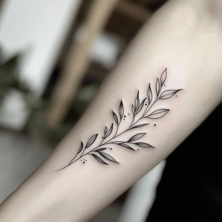 An AI-generated tattoo project concept presenting a slender black and grey fine-line botanical branch that drapes along the forearm. The design centers on a single stem with evenly spaced leaves and a scattering of tiny dots, rendered with clean linework and subtle shading to achieve a soft, organic rhythm. Symbolically, the motif evokes growth, renewal, resilience, and a quiet connection to nature, translating botanical imagery into wearable body art suited for meaningful tattoos. Its minimalist approach makes it a versatile option as a standalone accent or as a flexible element in larger compositions, offering a refined path for meaningful tattoos or as an understated extension of an existing sleeve. The repeating leaf pattern creates a gentle arc and positive negative space that preserves legibility on skin while maintaining elegance and legibility at different scales. From a technical perspective, the piece relies on precise fine-line technique, micro-needle precision, and a restrained grayscale palette to preserve delicate contrast on diverse skin tones, with careful attention to line weight, tip control, and spacing to avoid blotting. This concept also serves as a blueprint for a custom tattoo design, adaptable to variations in branch curvature or leaf shape, and suitable for both small tattoos and flower tattoo aesthetics such as lotus or rose motifs in black and grey. While the design centers on botanical simplicity, its adaptability makes it compatible with Japanese style tattoo principles of simplicity, balance, and natural form, enabling a timeless approach to body art, ink density, and overall composition. In sum, this AI-generated tattoo project concept demonstrates how a fine-line botanical branch can translate into a refined, meaningful tattoo design that remains legible, scalable, and elegant across multiple placements, from forearm to sleeve.
