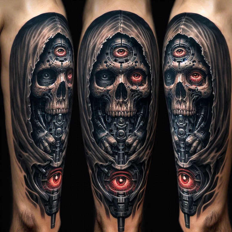 AI-generated tattoo project concept explores a dark cyber skull sleeve that fuses bone and machine. The central skull sits behind a fractured void, while a red-tinted eye gear dominates the upper face, surrounded by tubing and panelwork. Rendered in black and grey with precise shading, the piece uses smooth gradations, fine line detailing, and subtle stippling to evoke chrome, bone, and matte metal textures. The design flows as a sleeve, with the jawline dissolving into interlocking gears, pistons, and cables that wrap around the forearm and culminate in a focal point at the wrist. A graphic pattern of circles, screws, and mechanical plates creates a hypnotic rhythm that reads as both skull and machine, nodding to cyberpunk and industrial tattoo motifs. The high-contrast grayscale ensures depth and readability on skin, while the red accent sustains a dramatic focal moment. As a cover-up candidate, the composition utilizes large negative spaces and bold silhouettes to mask older ink beneath the new lines, making it practical for concealing previous work. The concept suits a bold, custom tattoo design for enthusiasts of realistic black-and-grey body art, Japanese-influenced mechanical themes, and intricate pattern work. It also exemplifies an AI-generated tattoo project, illustrating how technology can inspire meaningful tattoos that blend mortality symbolism with resilience and invention. In practical terms, the tattoo artist would plan for layered shading, varied line weights, and careful edge control to preserve the project’s graphic clarity as it wraps the limb, ensuring the pattern remains legible over time and age gracefully. This design ultimately offers a powerful statement piece: a dark, mechanized skull that encapsulates both decay and invention in one continuous, cover-up-friendly canvas.