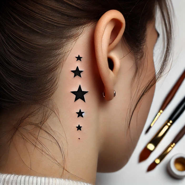 These AI-generated tattoo projects present a clean, minimalist neck motif: a vertical row of five stars in solid black along the nape. The shapes vary in size to create a visual rhythm, from a small star near the base of the skull to a larger star closer to the ear, then tapering again toward the lower neck. The tattoo is executed in black ink with crisp edges; the negative space around each star ensures readability across ages and skin tones. The composition is adaptable as a small tattoo design or as a component of a larger body art piece such as a sleeve or back piece. The repeating pattern of stars functions as a graphic motif that can be extended into other areas, aligning with patterns seen in graphic blackwork and Japanese-inspired minimalism, while still remaining a bold statement in black and grey. Symbolically, stars are often linked to guidance, ambition, and protection, making this layout a meaningful tattoo design for someone who prefers a discrete, high-contrast statement. In terms of technique, the solid fill approach ensures longevity and legibility, even as the wearer ages; the lines are compact, with careful alignment along the neck’s natural curve to preserve proportion on different body shapes. The concept sits at the crossroads of geometric and organic aesthetics, appealing to fans of small tattoos and minimal geometry. As an AI-generated tattoo project, this concept demonstrates how a simple star sequence can become a modern, wearable design with timeless appeal. It also serves as a strong option for a cover-up due to its crisp silhouette and high contrast against discolored skin or existing ink, though placement and aging considerations should be discussed with a professional. Manufacturing notes: The design translates well to different skin tones by maintaining a strong silhouette; in practice, the edges should be razor sharp with minimal shading to preserve legibility over time. For magazines, the line quality should be tested at various scales; this AI-assisted concept allows clients to visualize size and placement before committing to tattooing. It exemplifies how AI-generated concepts can inform traditional tattoo artistry and can be adapted to different body areas as needed.