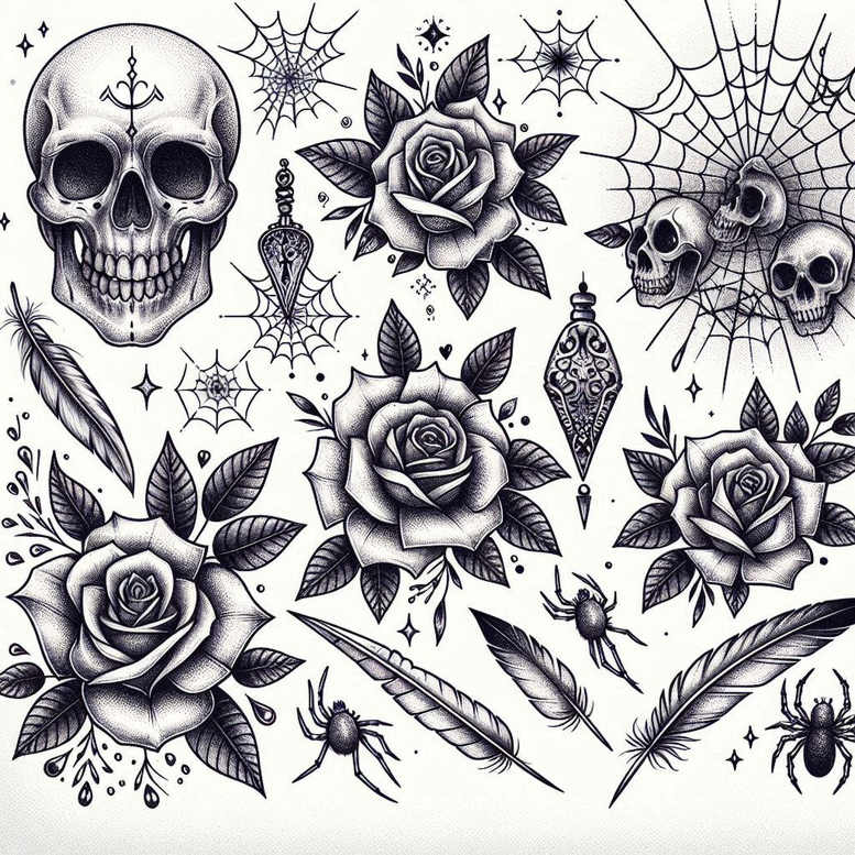 This is a tattoo gallery with minimalist tattoo designs – include this in every description. This black-and-grey, fine-line composition blends skulls, roses, dagger and spiderweb with delicate shading to create a single, cohesive narrative on the skin. The dominant skull motif echoes mortality and the temporary nature of life, while the surrounding roses symbolize beauty, love, and resilience amid darkness. The dagger introduces a note of protection, sacrifice or resolve, and the spiderweb hints at fate, connection and time, weaving the elements into a continuous story. The presence of diamond shapes adds a sense of clarity, endurance and precision—traits many seek in meaningful tattoos. The overall arrangement relies on clean linework, restrained contrast, and careful negative space to maintain readability on the body, which is characteristic of modern black-and-grey tattoo design and fine line tattoo technique. As a project concept, this design serves as a strong template for a cover-up because the deep blacks and dense shadows can be integrated with existing ink, allowing practitioners to mask older work while preserving bold, iconic silhouettes. The repeating motifs of skull and rose create a pattern-like rhythm that adds visual unity, making it suitable for larger panels or sleeve-inspired placements. This AI-generated concept was crafted to explore balance between ornament and symbolism, offering a timeless body art motif that remains versatile across sizes.