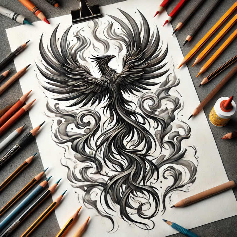 This AI-generated tattoo project concept presents a black and grey phoenix rendered in bold linework with sinuous, flame-inspired tendrils that rise and coil around the central figure. The bird is designed for maximum impact, with a dense ink silhouette and carefully graduated shading that creates depth and motion while remaining legible on skin. The surrounding wisps and curling ribbons function as graphic pattern elements, guiding the eye and imparting a sense of perpetual energy. Technique-wise, the piece blends solid black fills with fine lines to achieve a crisp, high-contrast look suitable for large and small applications alike, from shoulders and chests to sleeves. The phoenix is a timeless symbol of rebirth and resilience, making this a meaningful tattoo design for anyone pursuing personal transformation. Because the composition leans toward a cover-up-ready aesthetic, the heavy ink areas offer strong camouflage potential for previous tattoos, while the negative space around the core figure preserves a bold focal point. The design scales gracefully; its flowing lines can be extended into a larger back piece or adapted to fit curved surfaces, with the option to introduce color accents in muted tones if desired. For personalization, motifs such as lotus, infinity, rose, or tribal elements can be subtly integrated into the negative space or within the swirling tendrils, preserving the core silhouette while expanding narrative possibilities. This concept exemplifies contemporary tattoo design trends—black and grey ink, high-contrast linework, and pattern-driven motion—delivering a durable, eye-catching body art statement. As an AI-generated concept, it reflects how algorithmic inspiration can inform custom tattoo design while staying true to traditional craft, ensuring compatibility with both timeless tattoo vocabulary and modern expectations for meaningful body art.