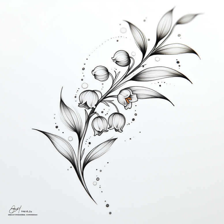This is a fine-line, black-and-grey botanical tattoo study. The composition centers on a slender stem climbing diagonally, bearing narrow leaves and delicate lily-of-the-valley bells. Crisp linework defines petals and sepals with controlled shading to create subtle volume while preserving the airy feel of the piece. A circular array of small dots and arcs floats around the stem, creating an ornamental pattern that adds texture without overwhelming the botanical core. The overall aesthetic nods to Japanese-inspired balance and restraint, while remaining adaptable as a modern tattoo design for contemporary ink. The Lily of the Valley motif evokes purity and renewal, making this a meaningful tattoo design for someone seeking a quiet, refined statement. This concept is an AI-generated tattoo project, illustrating how digital ideas can inspire traditional body art and serve as a flexible template for tattoo artists to adapt in real time. The pattern elements give the design a distinctive edge, enabling it to function as a small-to-medium piece or as a cover-up option when placed to leverage existing shading on light-to-mid-density skin. Although executed with a realistic feel, the artwork remains highly adaptable to different skin tones and tattooing styles—from ultra-fine line to gentle dotwork. For placement, forearm, rib, or shoulder profiles work well, allowing negative space to preserve legibility as the ink ages. In the larger ecosystem of flower tattoos and botanical art, this piece sits comfortably among fine-line designs and Japanese-style motifs, while still retaining universal appeal for those drawn to meaningful tattoos, flowers, and discreet body art. The supporting pattern work ensures it reads clearly as a cohesive tattoo design even at smaller sizes, and its black and grey palette keeps it versatile across skin tones and aging.