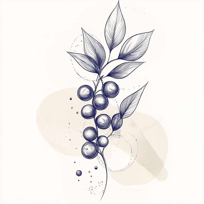 This AI-generated tattoo project concept features a fine line botanical branch with berries, rendered in black and grey ink. The piece emphasizes precise line work, controlled weight, and subtle shading to achieve a delicate yet legible silhouette that reads well at typical tattoo sizes. A central stem arcs upward, bearing a sequence of round berries and alternating leaves that taper to fine points. Shading is achieved with light cross-hatching and selective stippling to convey form without overwhelming the clean line aesthetic. Background elements include soft beige shapes and dotted circular motifs that function as a decorative pattern while leaving ample negative space for breathing room on the skin. The overall composition blends natural realism with ornamental geometry, giving it a modern, wearable feel appropriate for forearm, inner arm, calf, or collarbone placement. Symbolically, the branch suggests growth and continuity; berries evoke abundance; leaves symbolize renewal—a quietly meaningful tattoo design for someone seeking a small-to-medium piece with personal narrative. As an AI-generated tattoo project, it demonstrates how digital illustration translates into scalable line work suitable for a custom tattoo design. The concept straddles the line between classic botanical motifs and contemporary patterning, making it adaptable to Japanese style tattoo influences or more minimalist flower tattoo ideas, while remaining within the black and grey palette. It is designed to pair well with other botanical elements, yet stands strong as a standalone tattoo design for those who prefer subtle body art. The presence of pattern elements—dotted rings and circular accents—adds texture and a current aesthetic without sacrificing legibility, which is important for fine line tattoos. This approach aligns with trends in small tattoos and flower tattoos, offering a timeless option that remains meaningful, versatile, and ready for personalization. Whether expanded later into a larger piece or kept as a refined single motif, the tattoo design conveyed by this concept emphasizes craft, clarity, and a contemplative mood.