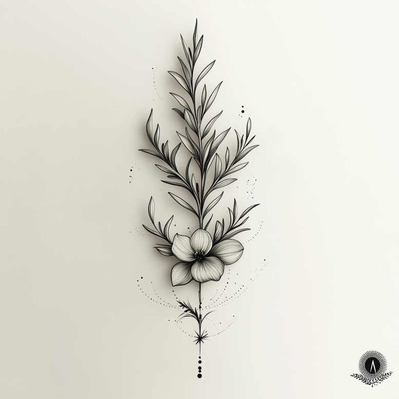 This black-and-grey fine-line botanical tattoo design emphasizes delicate line work and subtle shading to create a refined, wearable motif. At center is a blooming flower with slender petals, followed by a vertical stem and elongated leaves that rise in a balanced arc. Fine lines, soft grey gradients, and strategically placed dots frame the composition, yielding a readable image that works well on forearms, calves, or spines. The arrangement forms a cohesive botanical design that can be expanded into a larger custom tattoo design if the client wishes a sleeve or larger torso piece. The flower symbolizes renewal and beauty, while the surrounding foliage suggests growth and resilience—meanings that resonate with meaningful tattoos and small tattoos since the piece remains legible in black and grey over time. The technique embraces the fine-line tattoo ethos: crisp outlines, restrained shading, and generous negative space to preserve clarity. Pattern elements emerge through dotted arcs and circular motifs, lending a soft texture without overpowering the central subject; these features also support potential cover-up scenarios should they be needed. For studios, the concept translates into a timeless body art silhouette, suitable for Japanese-style influences and a modern minimalist aesthetic. This AI-generated tattoo project concept showcases how digital ideation can inform traditional tattoo planning, while the core motifs—flower, stem, leaf—guide the client toward a refined, long-lasting tattoo design in black and grey ink. Keywords: tattoo, tattoo design, meaningful tattoos, fine line tattoo, flower tattoos, custom tattoo design, Japanese style tattoo, black and grey, ink, body art.